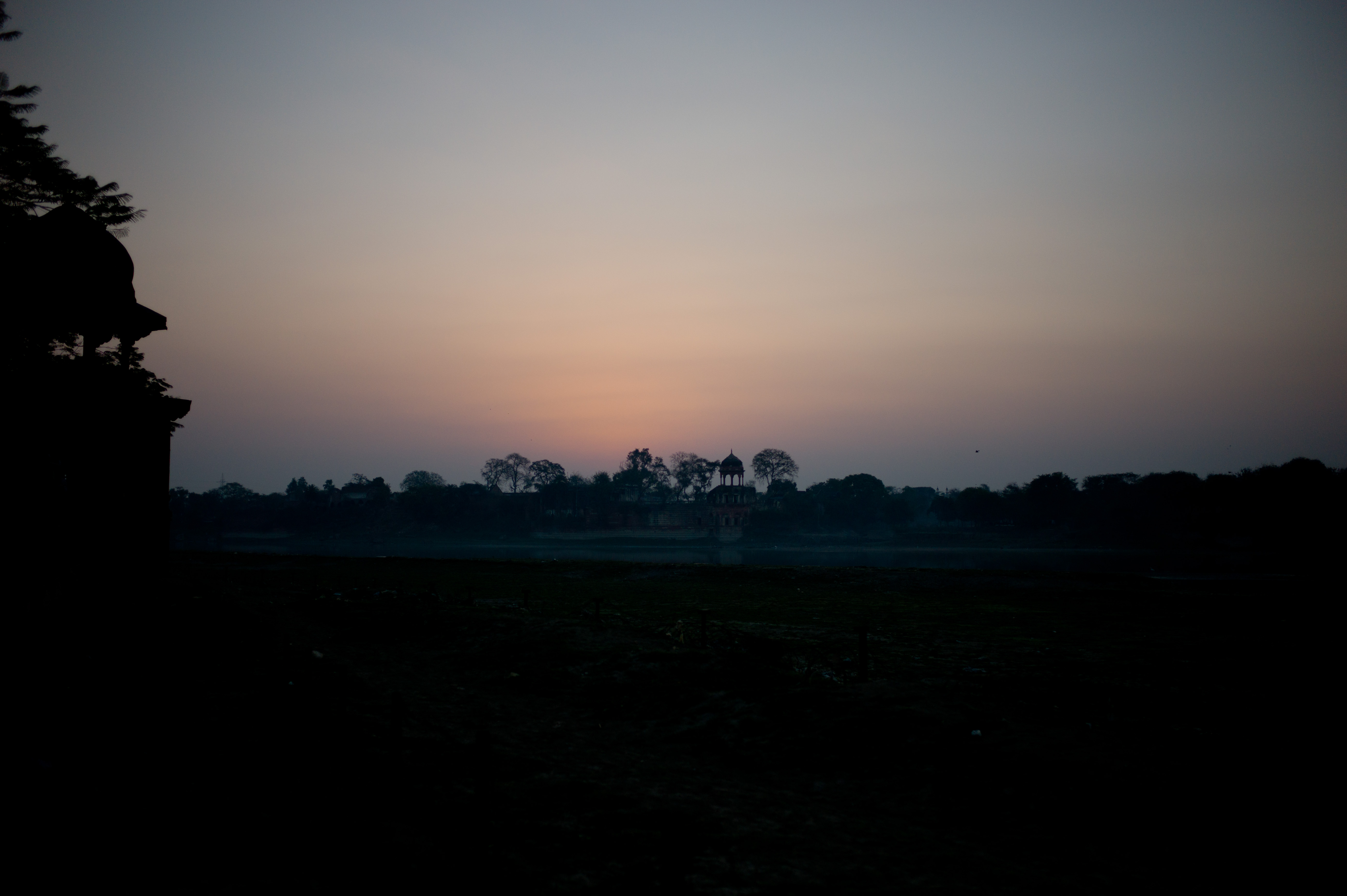 Arriving at the river side, we soon noticed a red glow coming up on the left behind one of the structures and we were soon treated to the sight of a red eggyolk sunrise over the Yamuna river, bathing the Taj mahal in its soft light. Viewing the Taj in the dawn light also means you can see the many birds that were waking up! One problem we noticed was that the rising sun was way to the left of the Taj as we faced it and so it was difficult to put the sun and the Taj in the same picture from where we were . For my next visit to the Taj, I would go to Agra Fort which I could see downstream and it appeared to be right in line with the Taj and the rising sun…imagine the Taj silhouetted by a red orb rising sun!