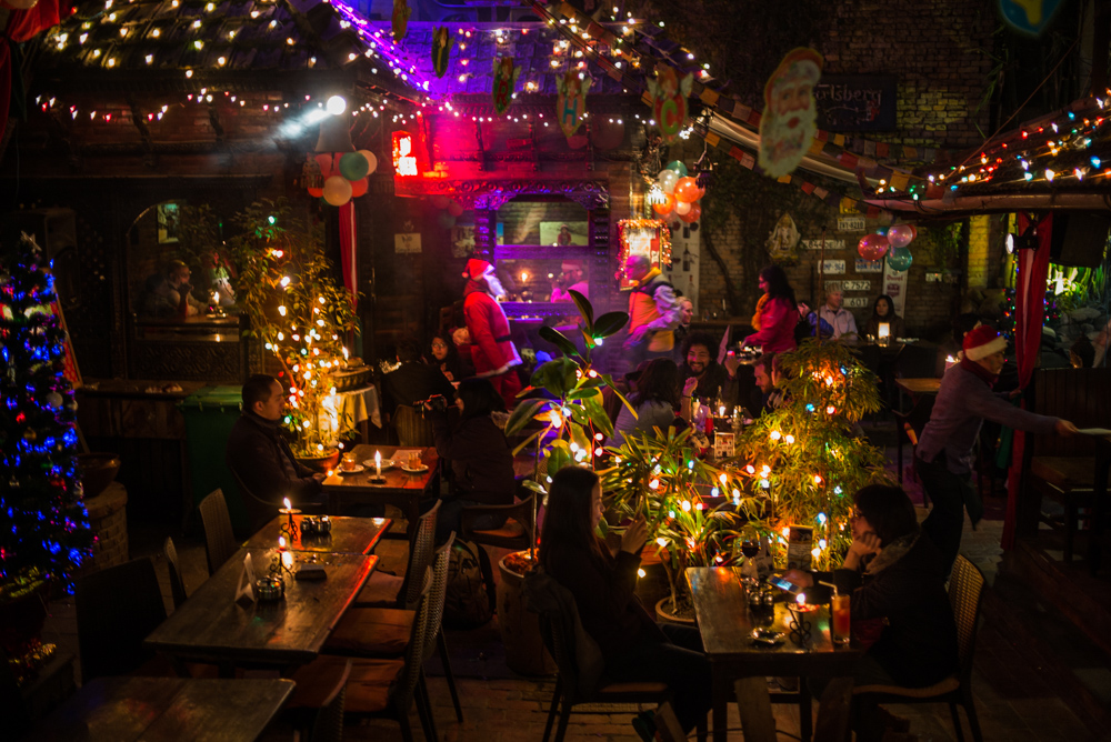 We had Christmas in Kathmandu and it was fairly quiet; the atmosphere in the New Orleans cafe opposite the Kathmandu Guest House was nice, the spaghetti good and the new age music bad…