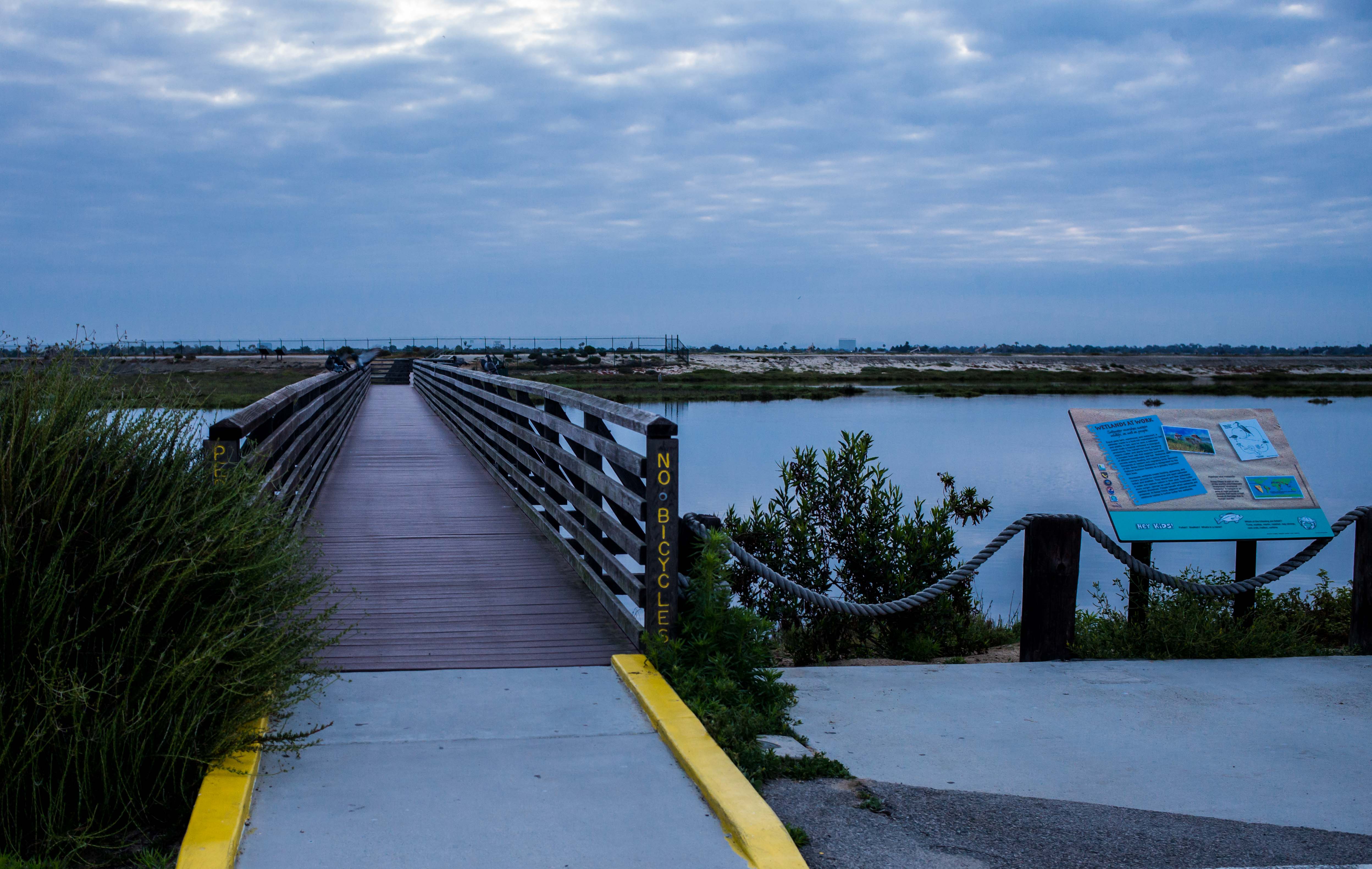 The entrance to Bolsa Chica Wetlands from the carpark on Western Pacific Highway leading to the wooden bridge