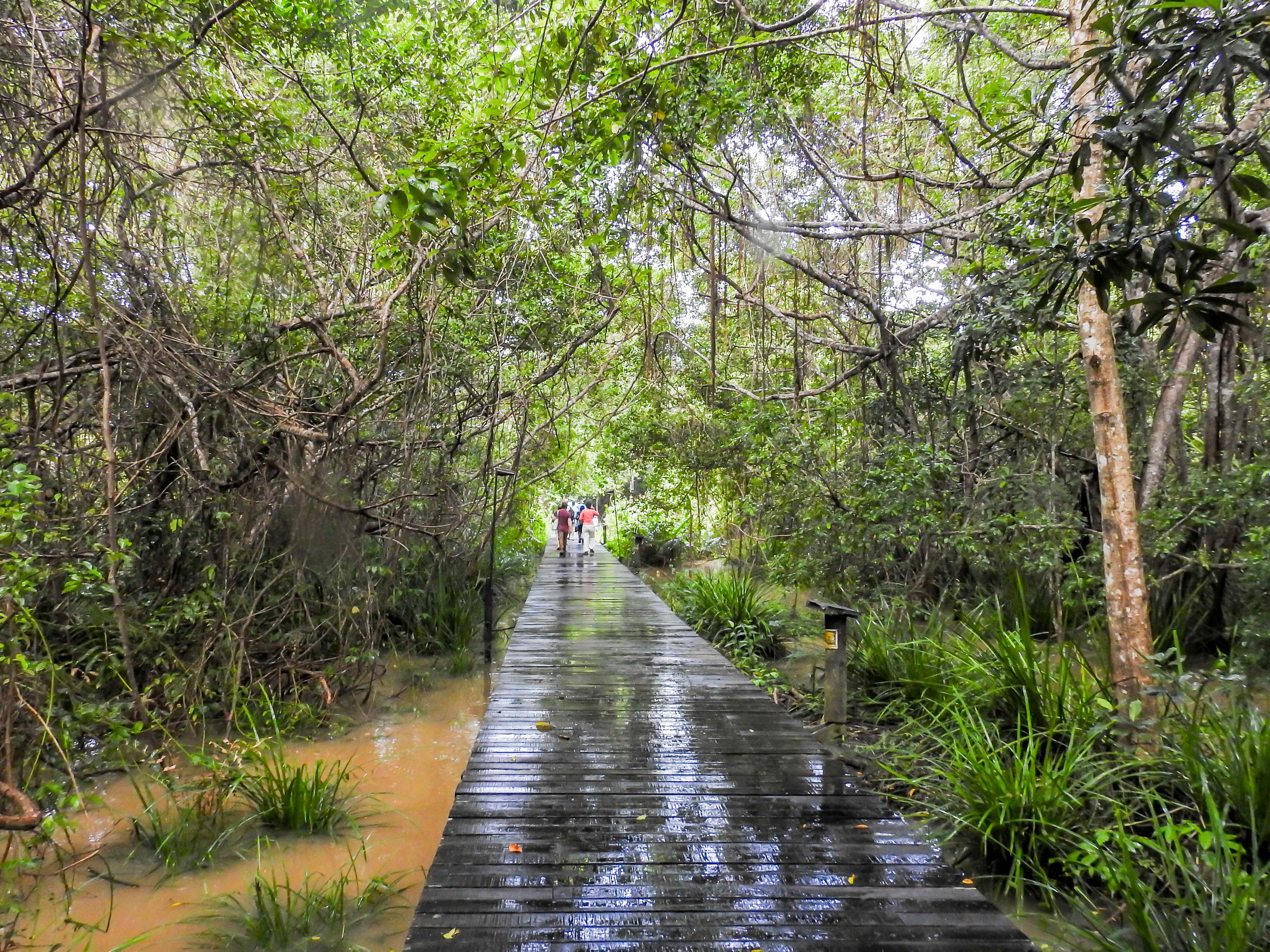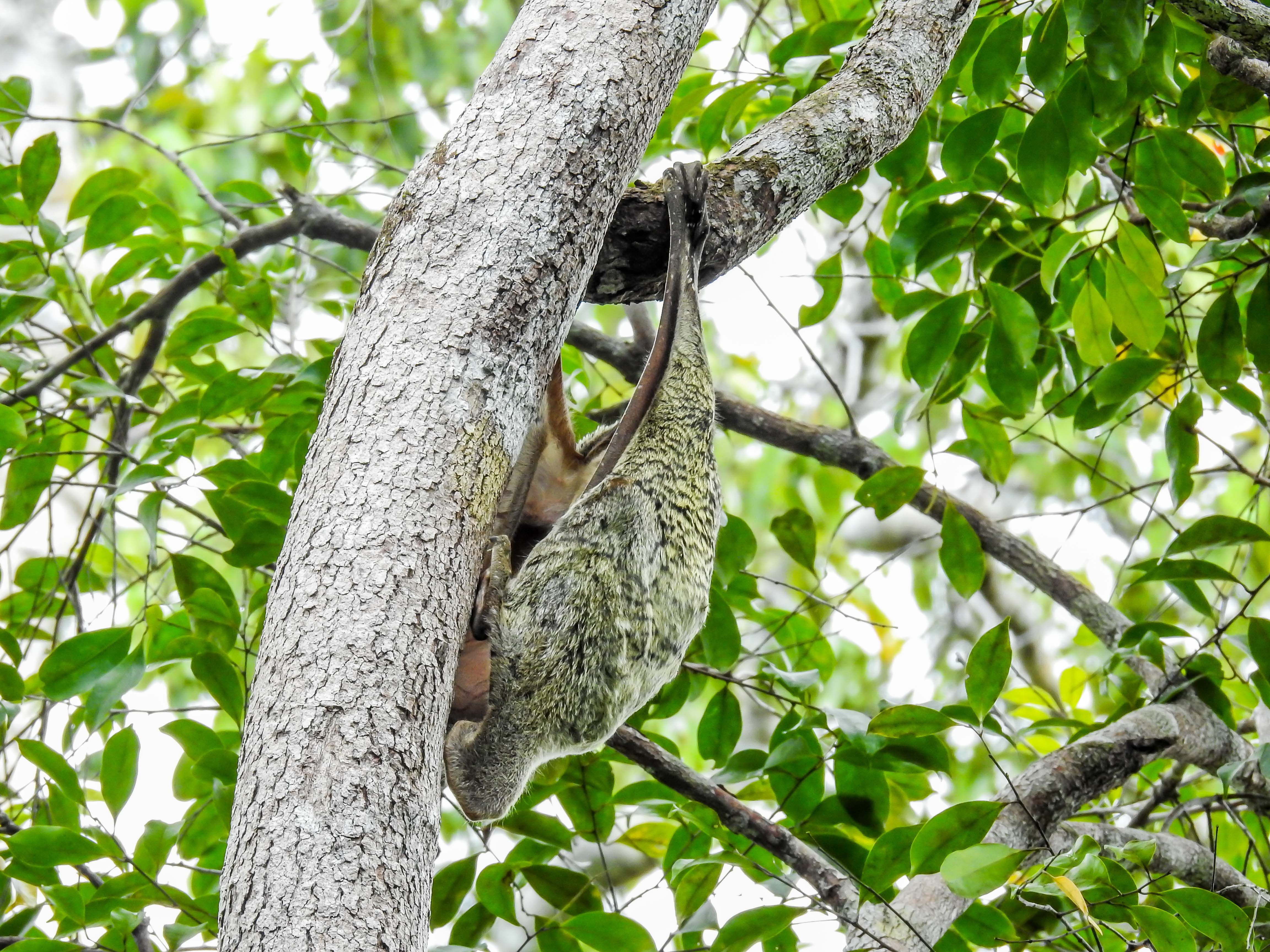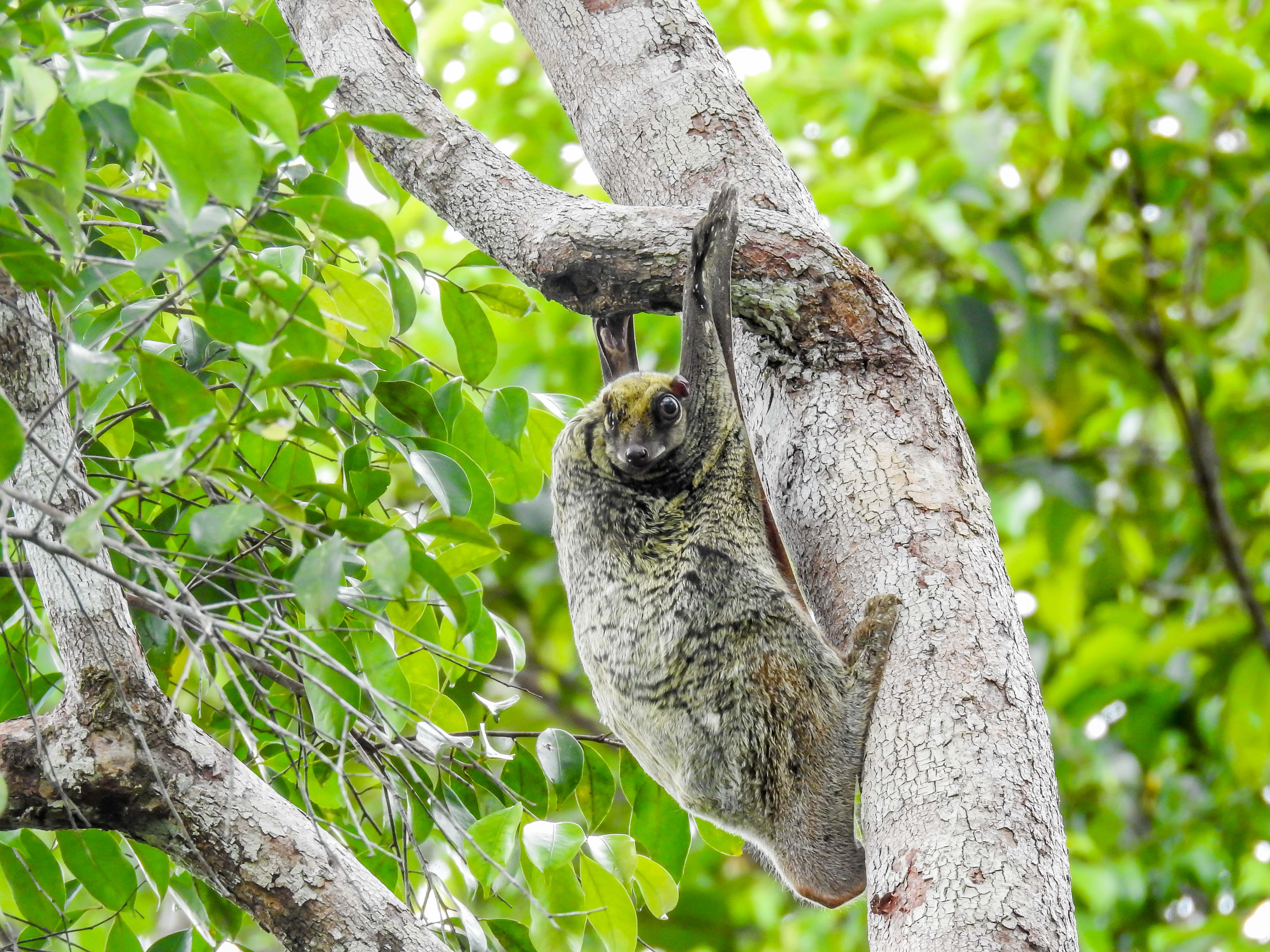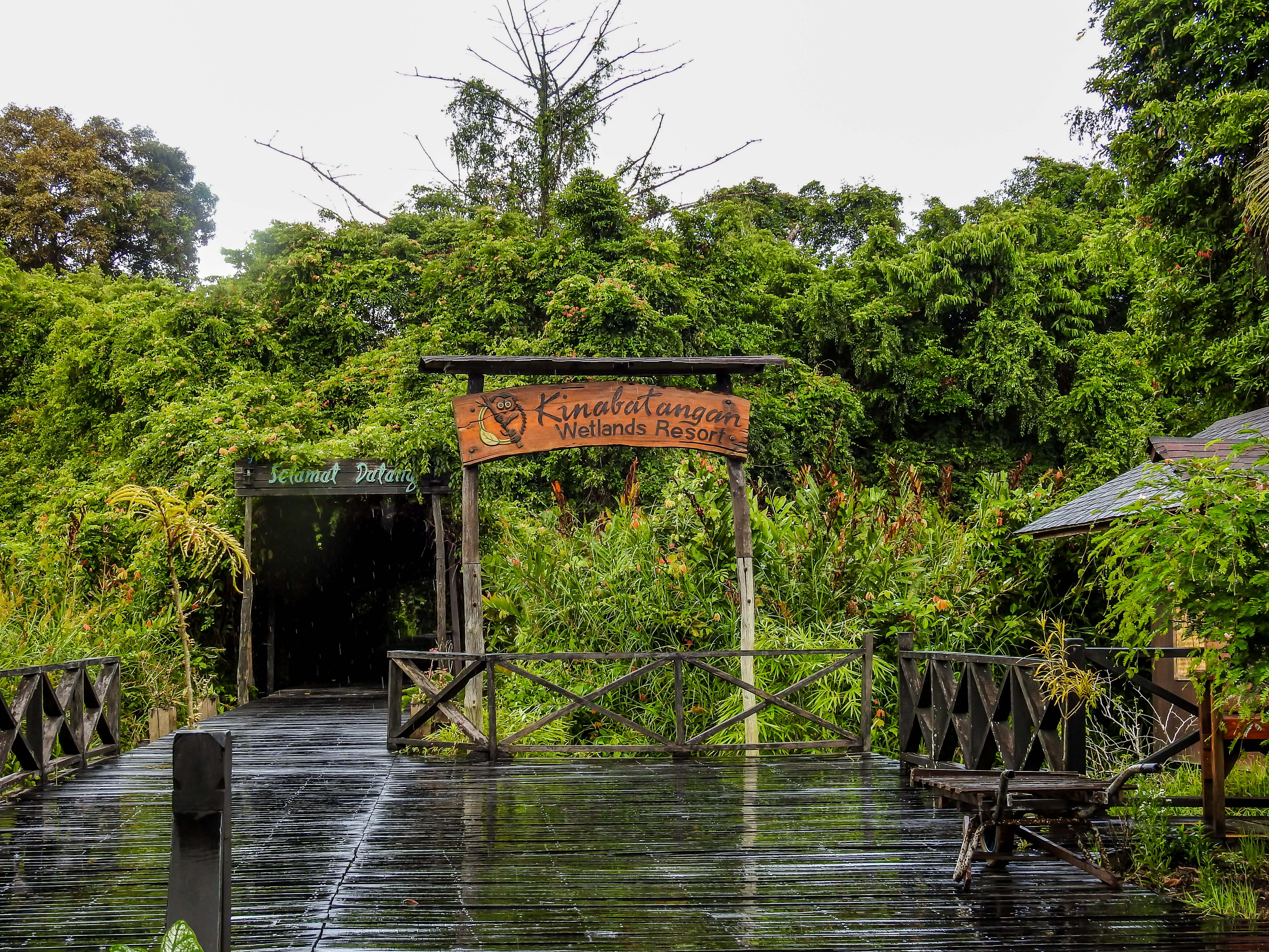 On the way to the KWR along the kinabatangan river…..the water is coffee brown in colour….arriving at the KWR jetty which is on a small tributary of the main river…..palm fringed shoresa wet welcome to the KWR….the rooms are accessed via this boardwalk and there are plenty of birds around….Along the footpath, this pregnant colugo hung from the treeand checked us out….