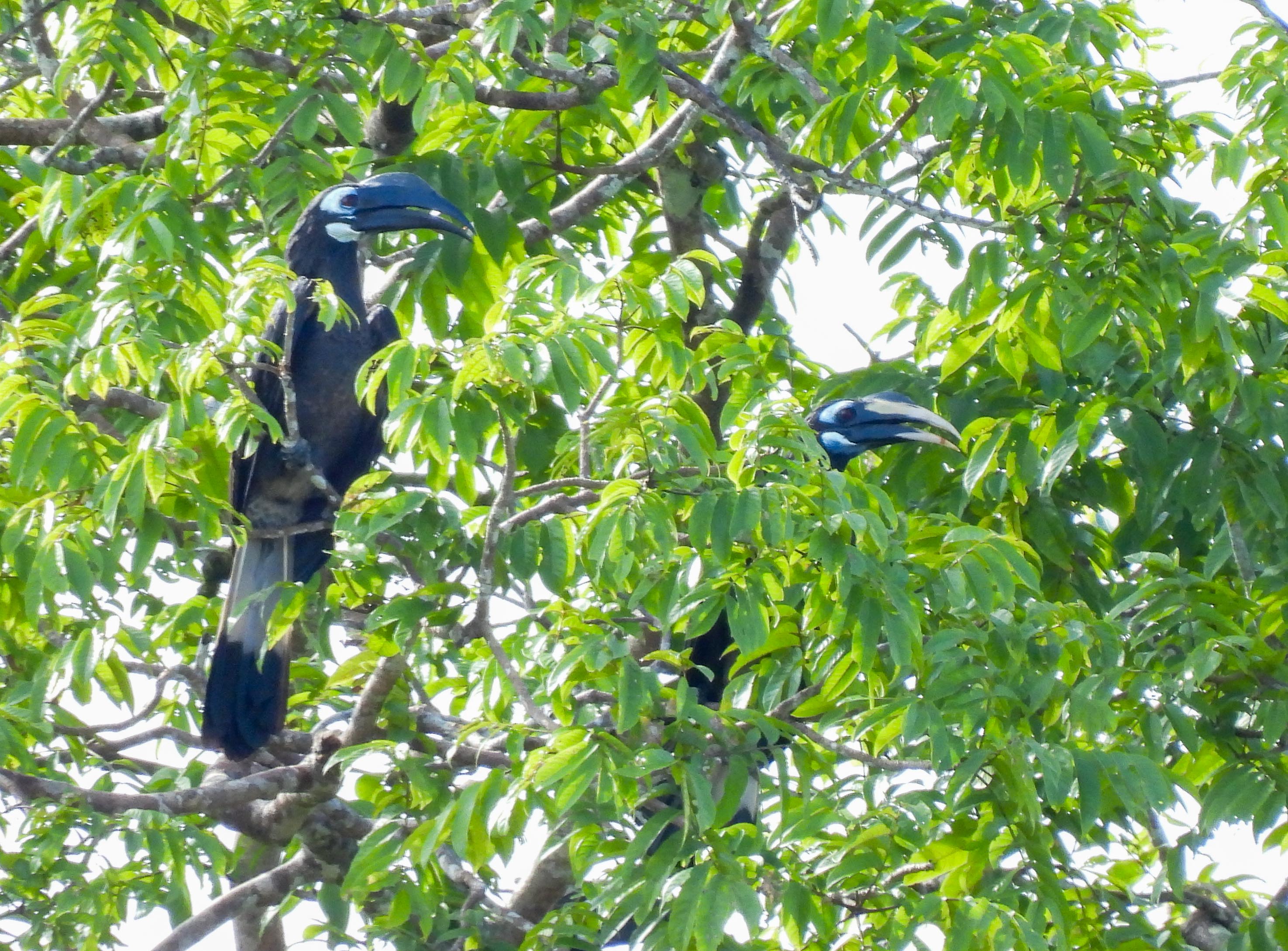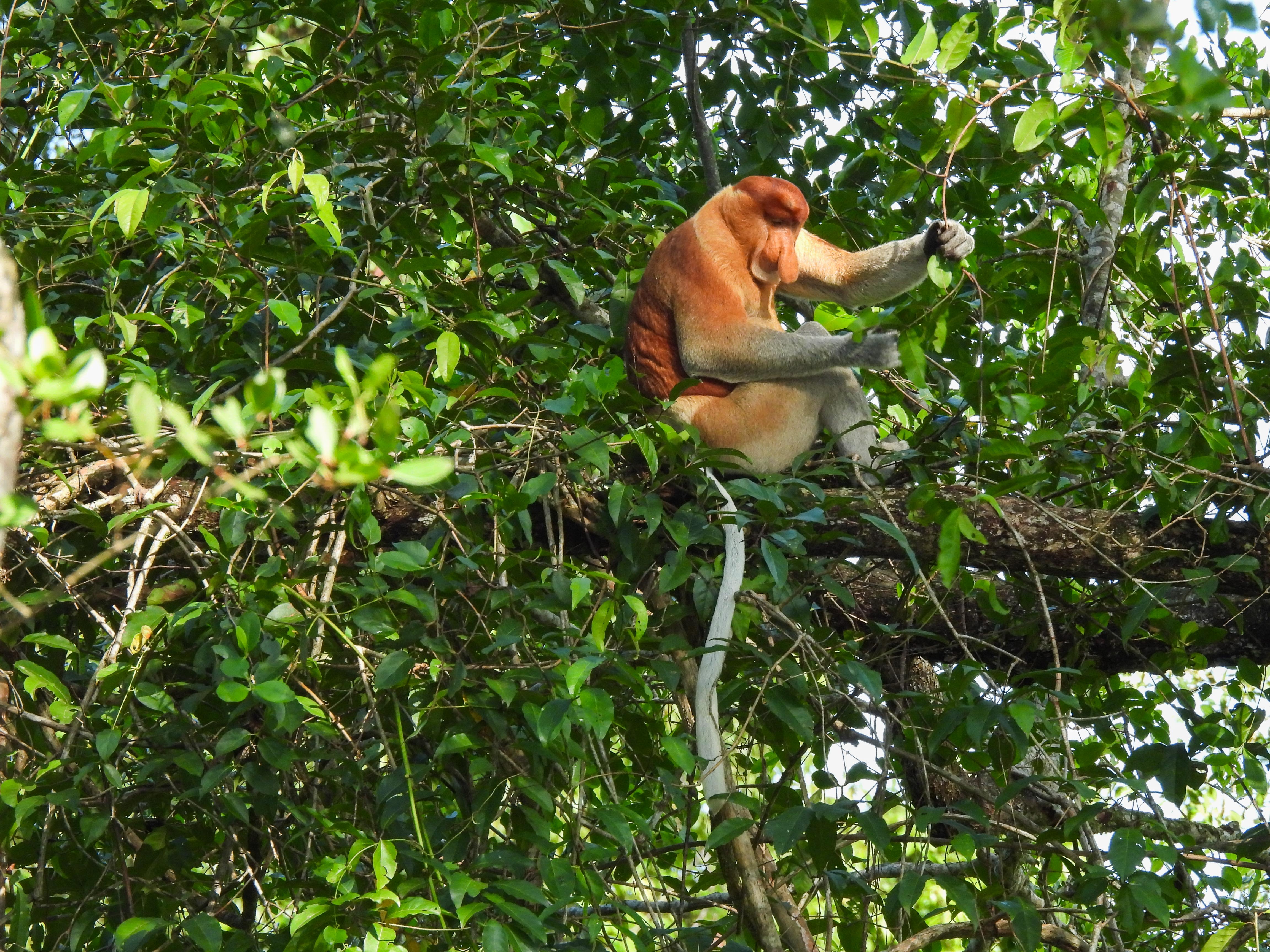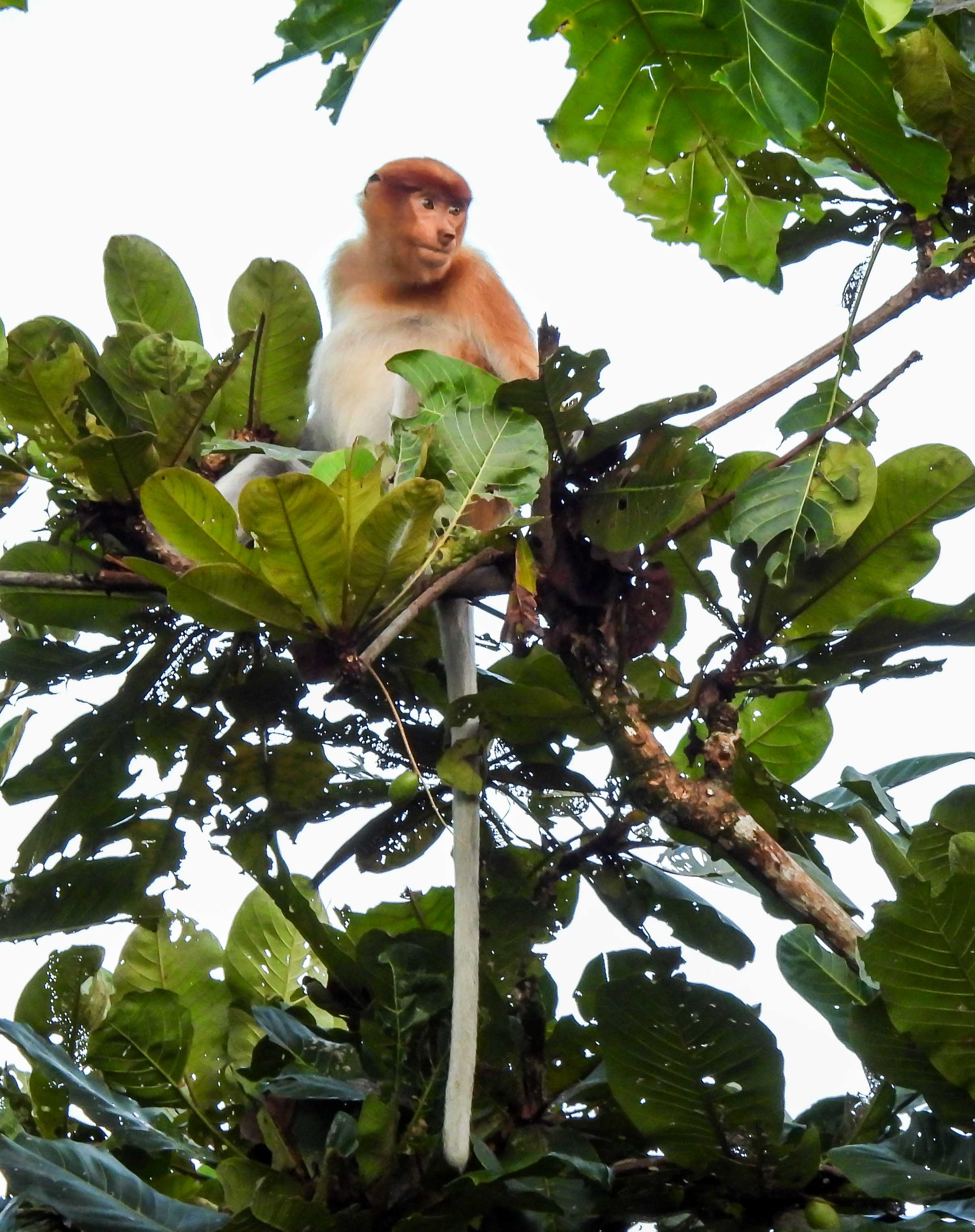 we soon saw our first proboscis monkey high up a tree along the river…here a female with her snub noseand another female with her long white tailof course the male proboscis monkey with the pendulous nose is the more impressive…His rich shade of brown is contrasted by the grey limbs…But we were on a river safari so we watched out for life in the river too….a large 4m long crocodile swam quietly not far awayand sightings of the majestic white belly sea eagle were frequentLesser adjutant storks high up in the treeslesser adjutant stork in flightand then a flock of 4 hornbills made their way across the riverstopping just long enough in the trees for us to shoot….the Bushy Crested Hornbill…I guess the one with the ebony black beak is the male and the one with the white beak, the female…note the bicoloured tailand when we moored by the shore to have breakfast, this charming ashy tailorbird came by with a beakful of nesting material….ashy tailorbirdCommoner birds like the collared kingfisher were also presentthis impressive nest belongs to the black and red broadbill but there was no sign of activity