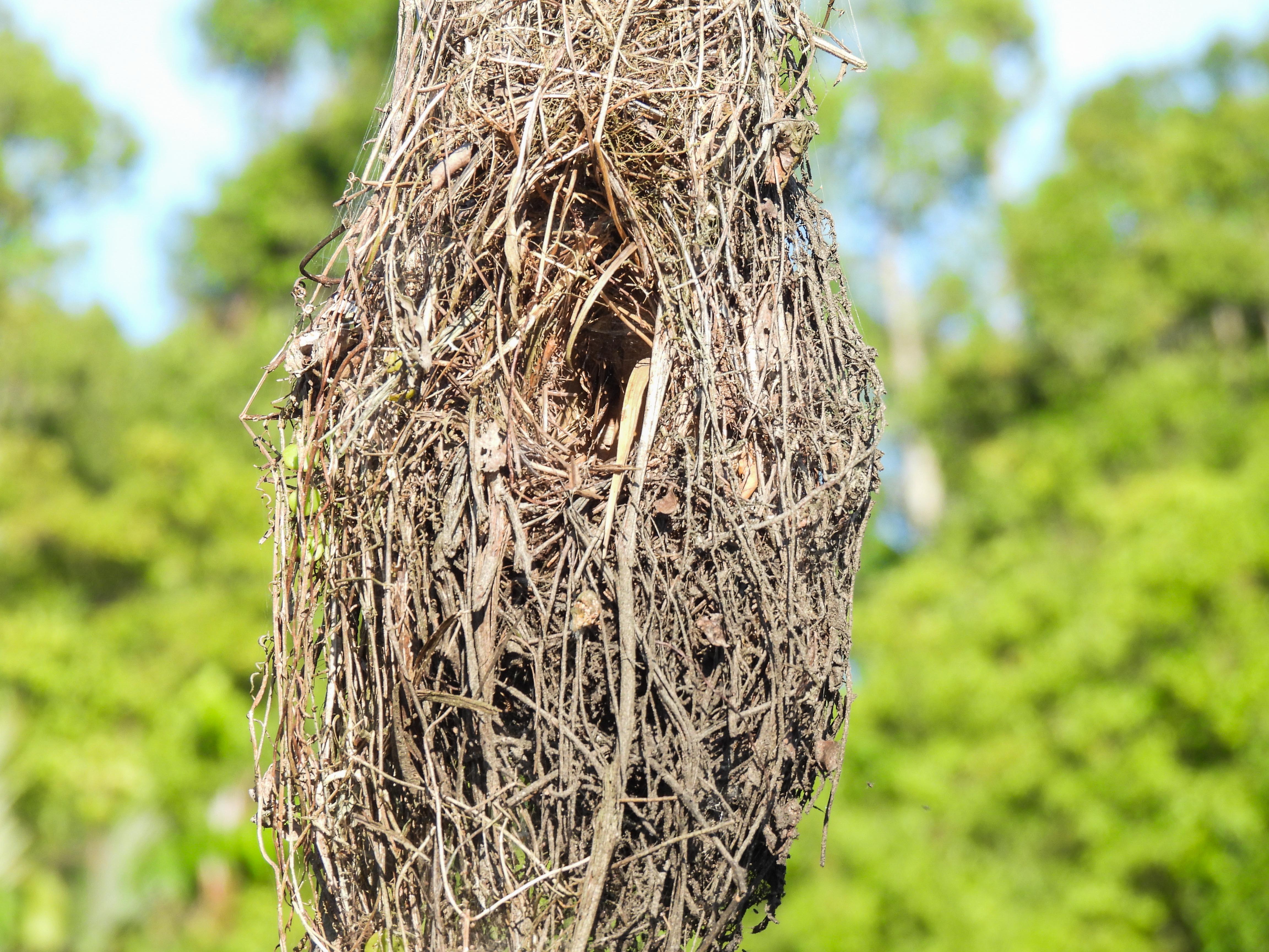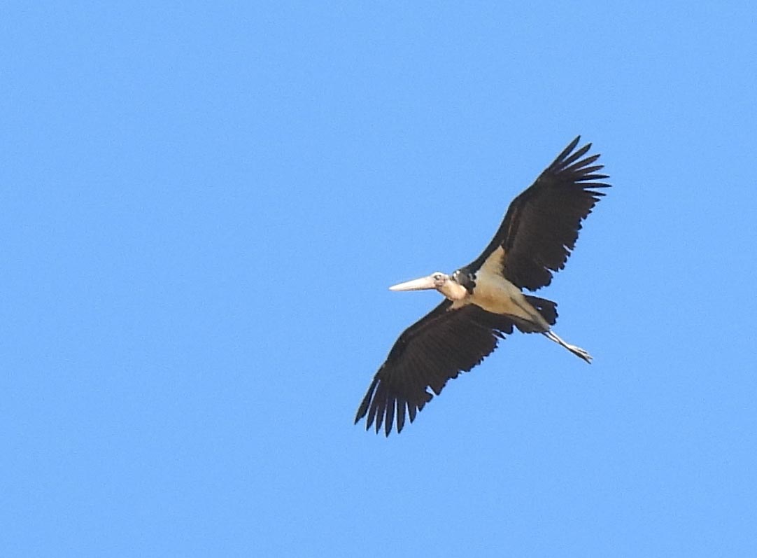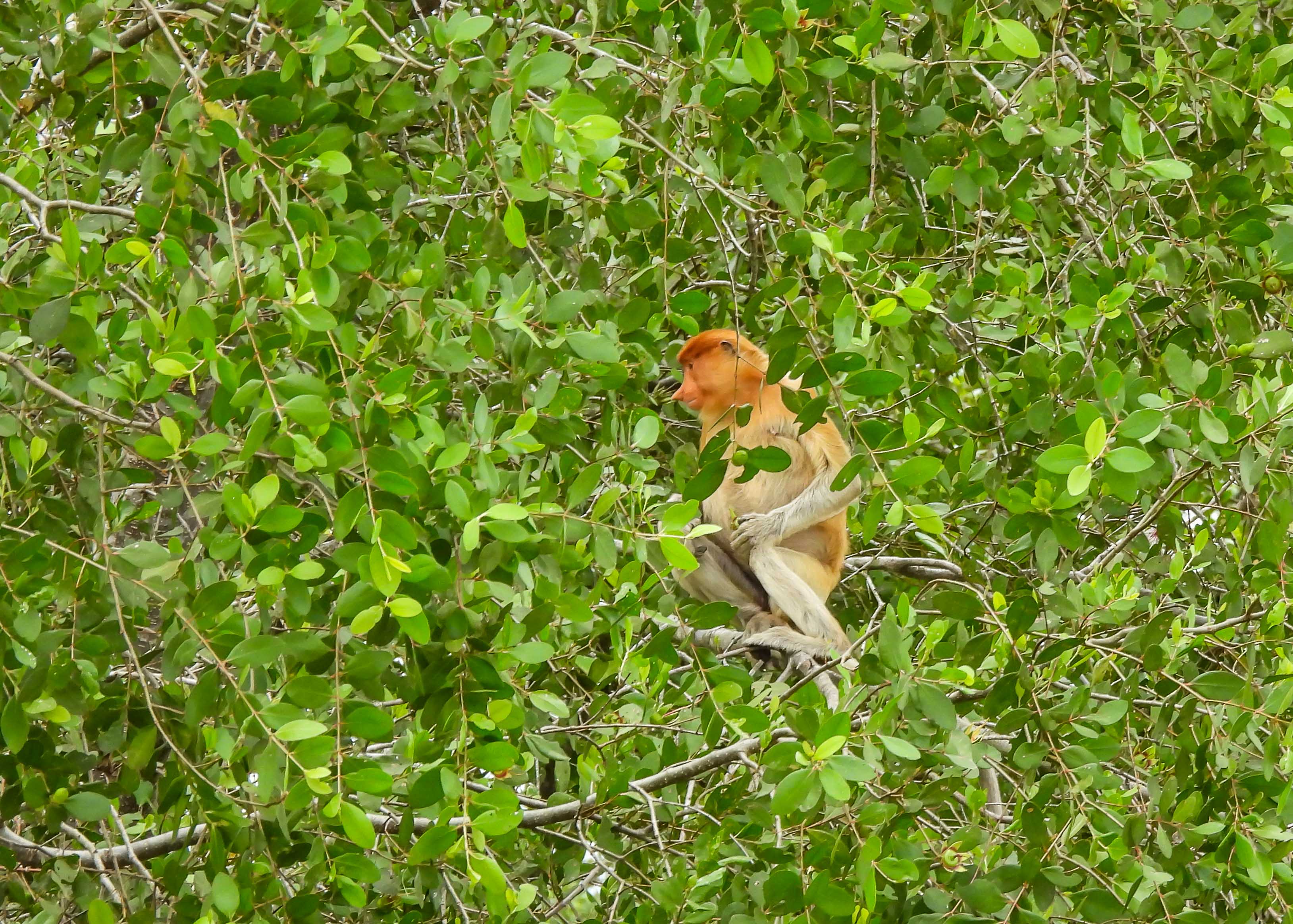 we soon saw our first proboscis monkey high up a tree along the river…here a female with her snub noseand another female with her long white tailof course the male proboscis monkey with the pendulous nose is the more impressive…His rich shade of brown is contrasted by the grey limbs…But we were on a river safari so we watched out for life in the river too….a large 4m long crocodile swam quietly not far awayand sightings of the majestic white belly sea eagle were frequentLesser adjutant storks high up in the treeslesser adjutant stork in flightand then a flock of 4 hornbills made their way across the riverstopping just long enough in the trees for us to shoot….the Bushy Crested Hornbill…I guess the one with the ebony black beak is the male and the one with the white beak, the female…note the bicoloured tailand when we moored by the shore to have breakfast, this charming ashy tailorbird came by with a beakful of nesting material….ashy tailorbirdCommoner birds like the collared kingfisher were also presentthis impressive nest belongs to the black and red broadbill but there was no sign of activity