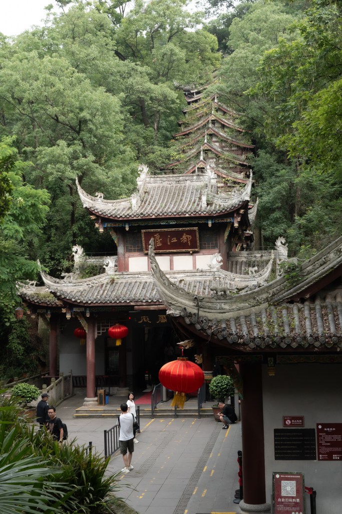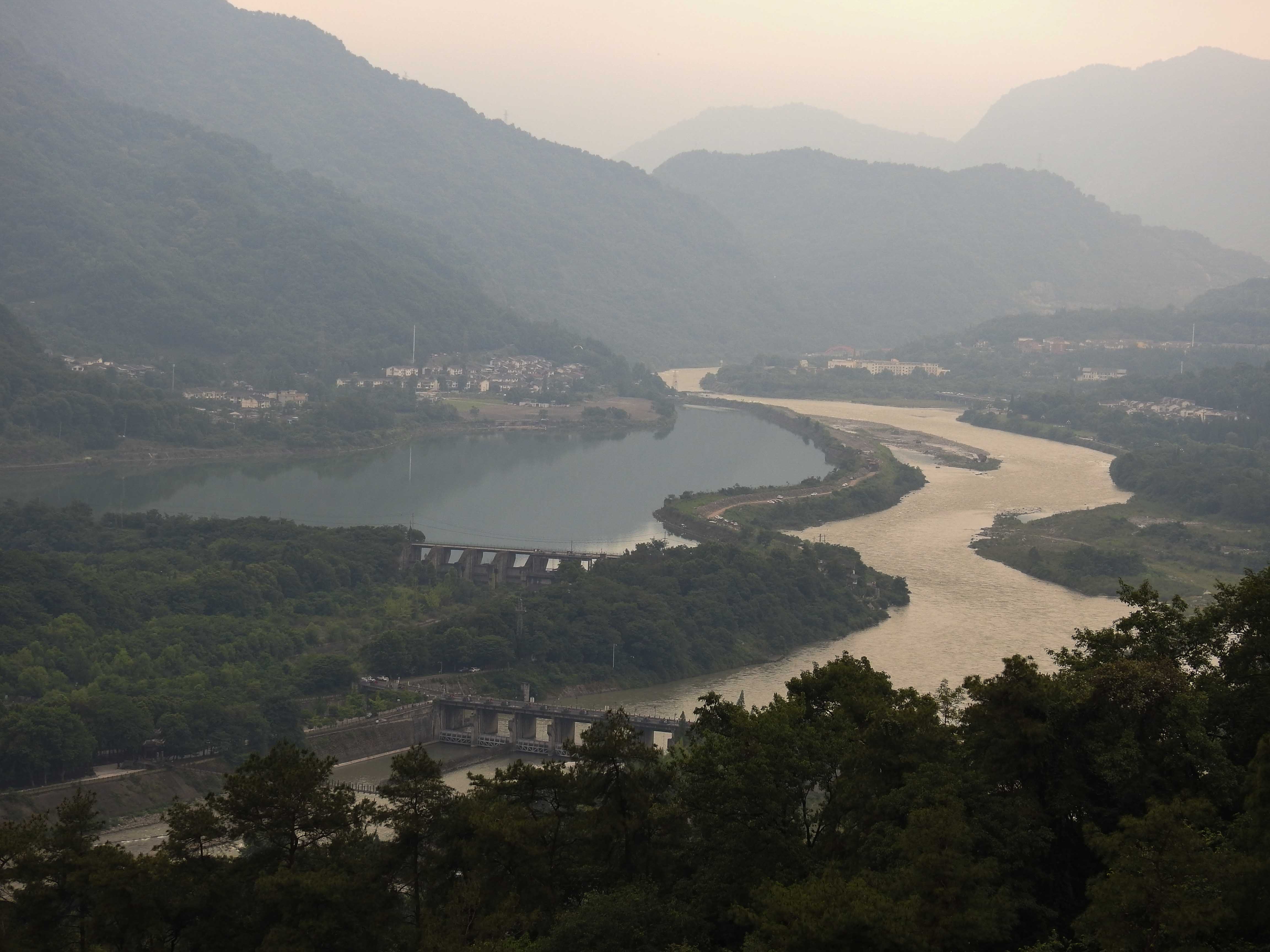 The Doujiangyen irrigation system was built more than 2000 years ago by an astonishingly smart and far sighted governor of the region called Li Bing. It was a system of without dams, using weirs for flood control, irrigation of the plains and water supply. Amazingly it is still in use today! We started our tour by taking a very long covered escalator up to YuLei Pagoda to get a panoramic view of the waterways….