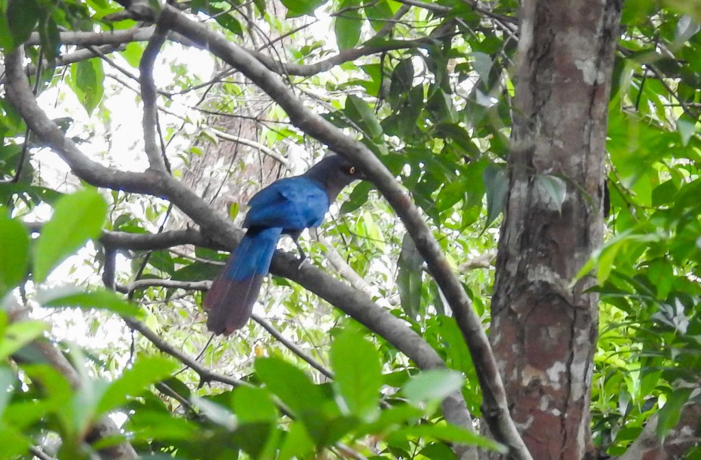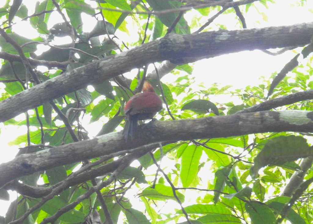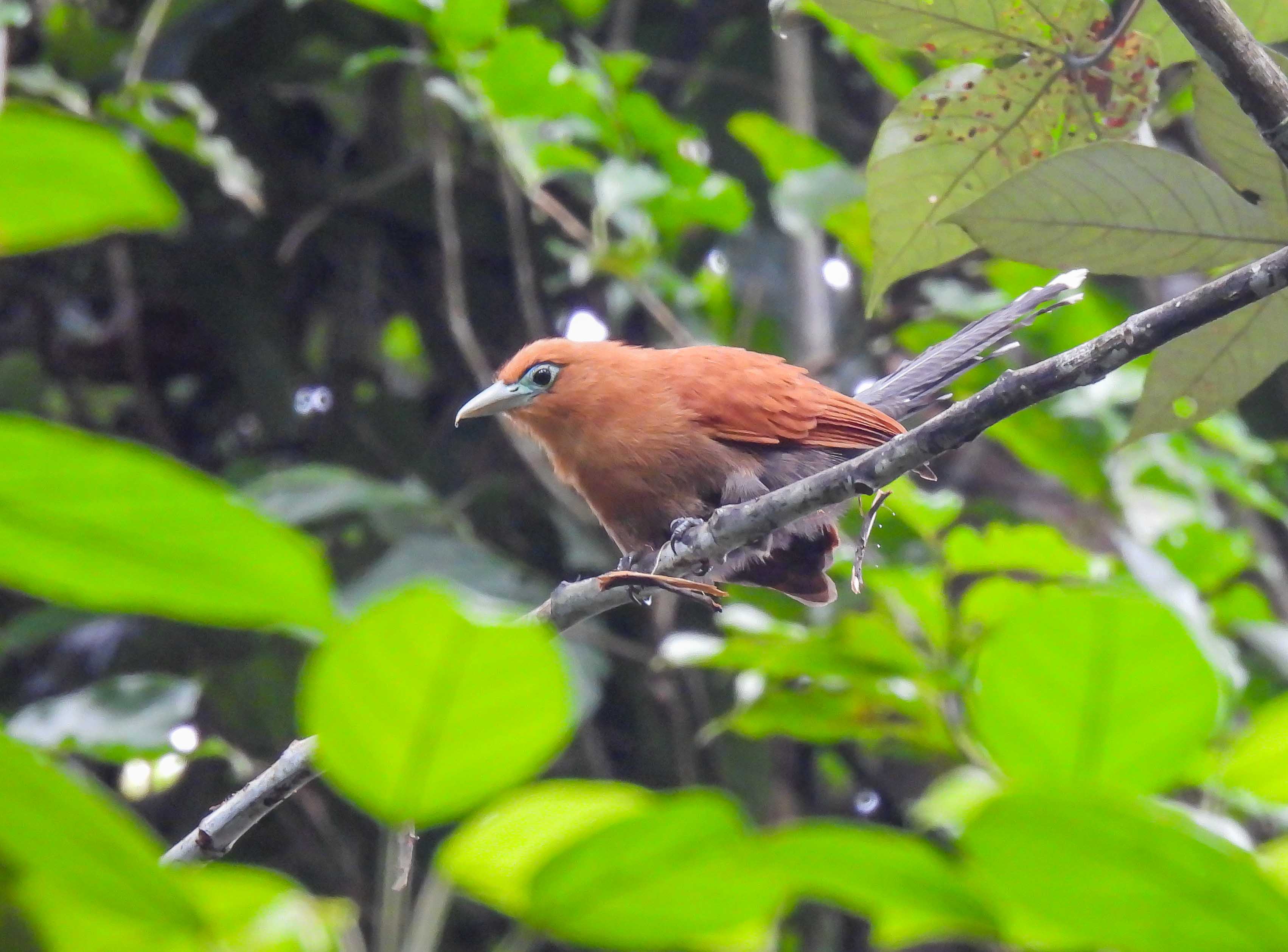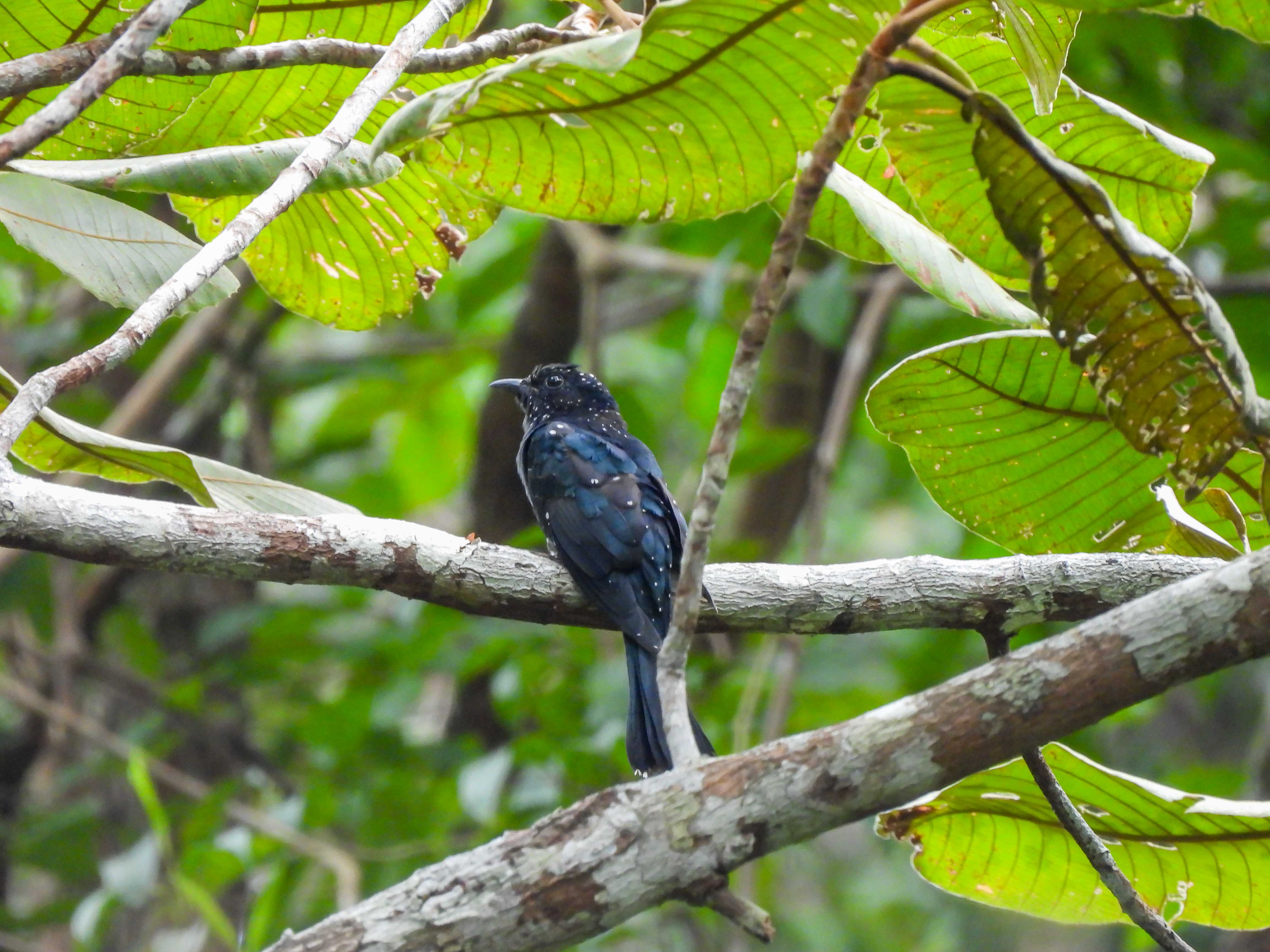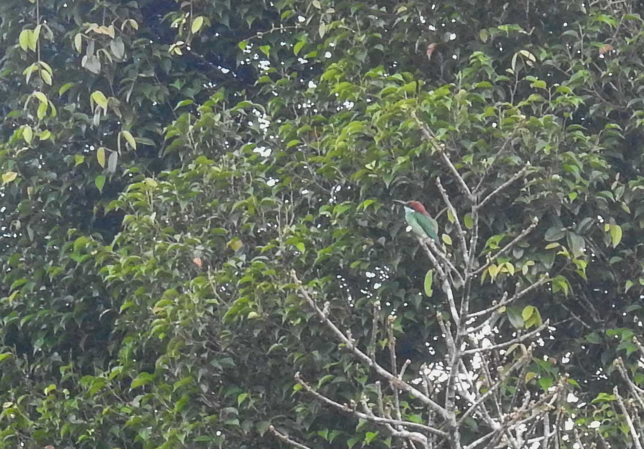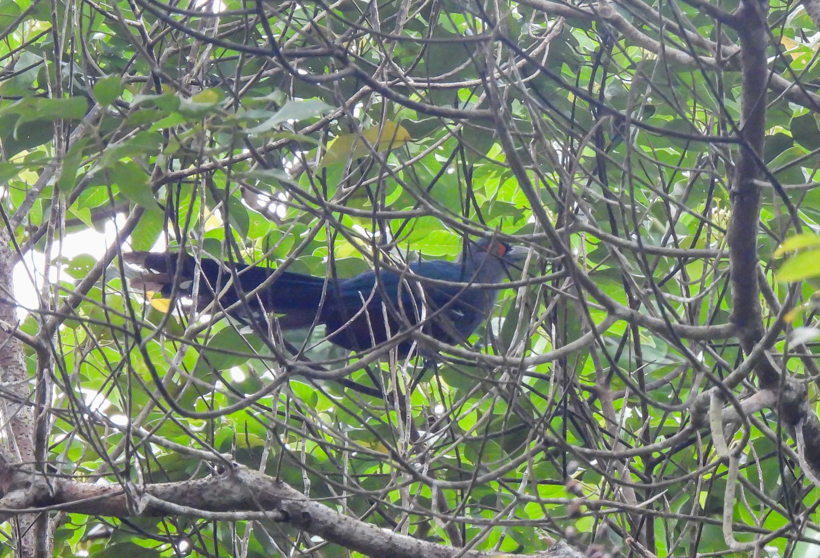 secondary rain forestblue throated bee eater…we disturbed an olive winged bulbulbrief glimpse of the yellow breasted flowerpeckercream vented bulbuland then this large bird appeared..the green billed malkoha with its bright red facial skin around the eye, pale green bill…also known for its very long tail, the green billed malkohaand then at the top of a tree , the well camouflaged greater green leafbird and then the second of the malkohas seen on this outing….the lovely Raffles Malkoharaffles malkoharacquet tailed drongo with raffles malkoha for companya woodpecker briefly perched…possibly the checker throated WPand then the final malkoha of the morning, the chestnut breasted malkoha who refused to show his chestgreater racquet tailed drongo