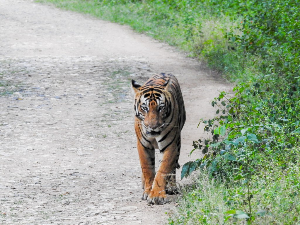 It was already nearly 6pm and we were heading back resigned to having had a decent afternoon’s birding without big cat sightings…..when we rounded a corner in the road …..and our driver yelled..tiger tiger! Seated in the middle row of the jeep, I stood up and looked down the road….