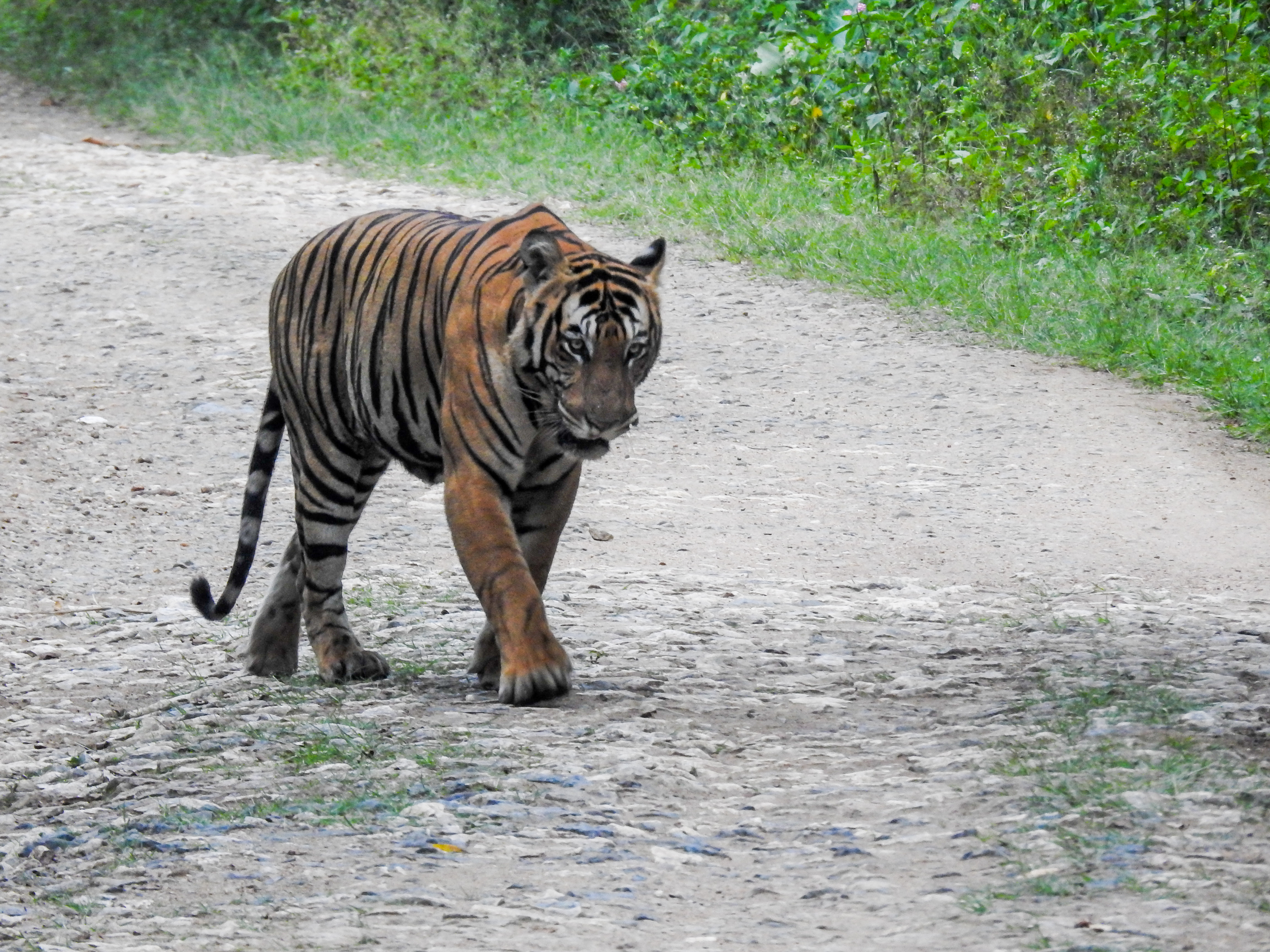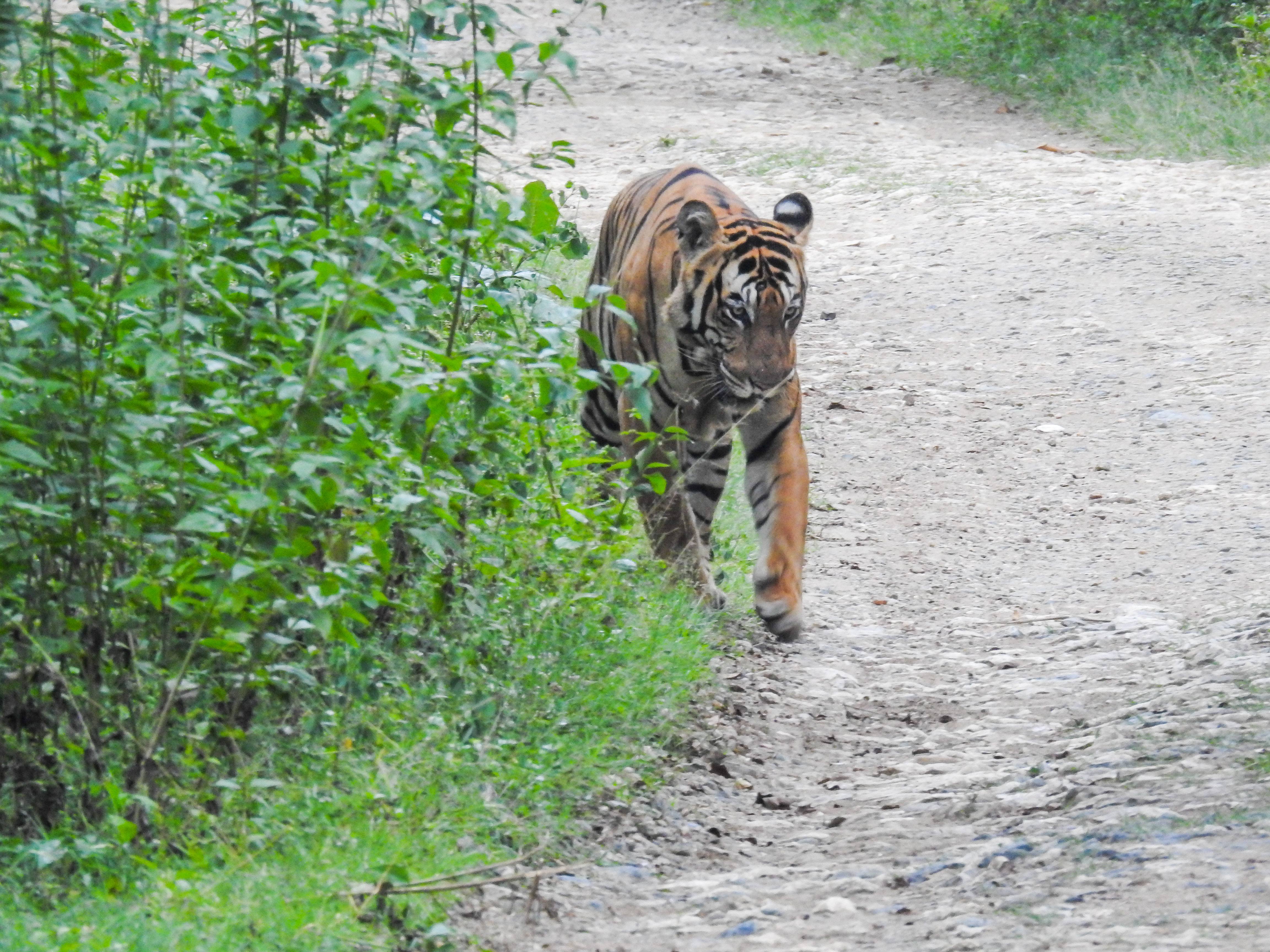 It was already nearly 6pm and we were heading back resigned to having had a decent afternoon’s birding without big cat sightings…..when we rounded a corner in the road …..and our driver yelled..tiger tiger! Seated in the middle row of the jeep, I stood up and looked down the road….