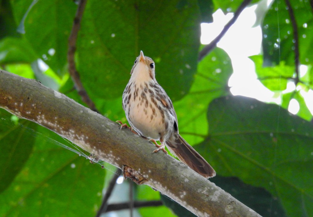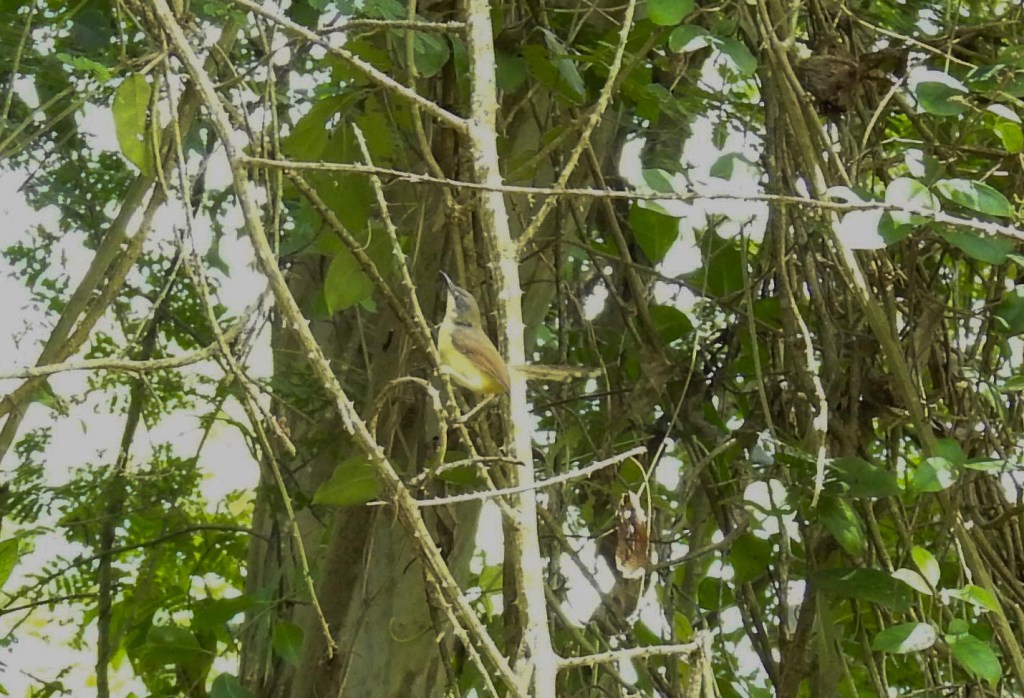 After our water safari on day 2, we spent an hour on the grounds of the Serai resort, walking around the greenery and listening to the bird calls…between our rooms 10 and 11 and the restaurant, I heard this strident 2-3 tone call which Merlin identified as possibly the uncommon Puff throated babbler….