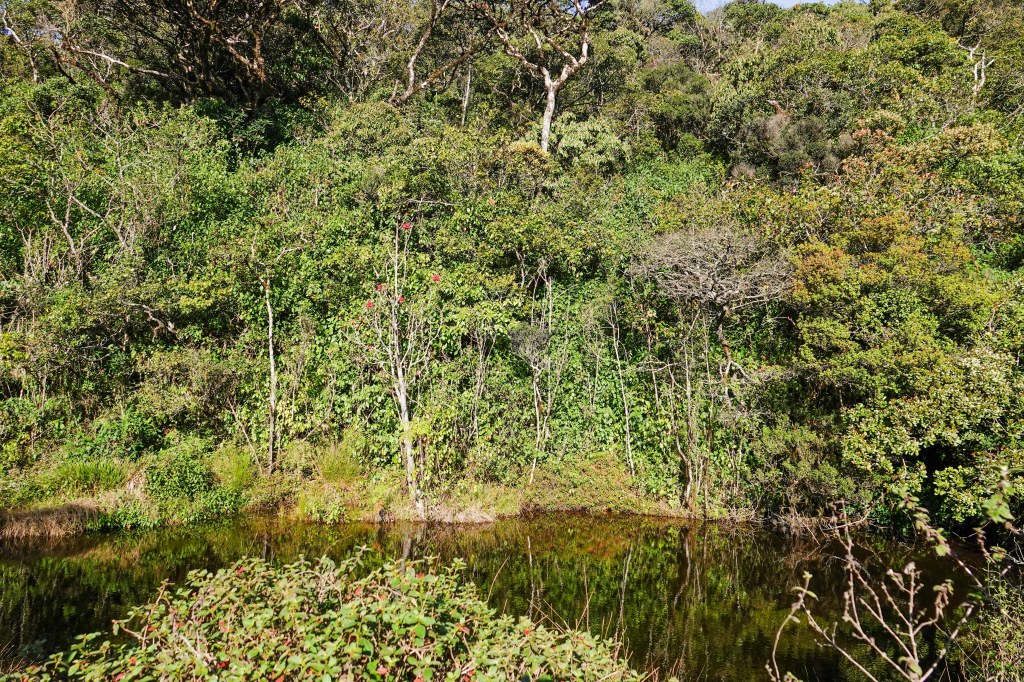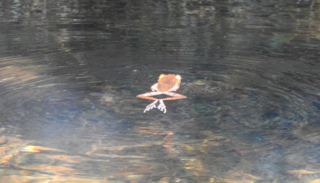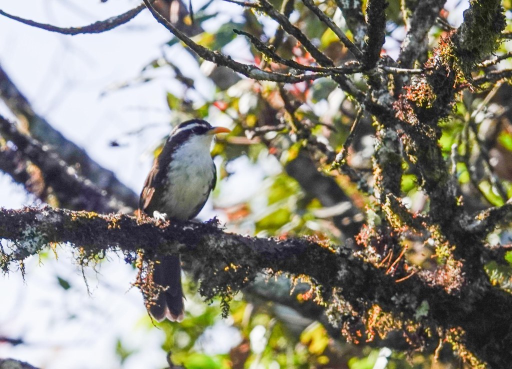 sure enough as the sun gradually illuminated this corner of Nuwara Eliya, the wood pigeons arrived! E30! We’d hit the 30/35 endemic targets…Sri Lankan Wood Pigeon (E30)We also saw the Indian blue robin at the same location later that morningthe entrance to Horton Plainswe entered from the Pattipola entrance at the north and headed to the Park office near the southern end..Just after the park entrance, we came across a lovely pond which was where we spent the most time tracking down a few more endemics….this pond occupied us for a good hour and a half….cool montane floraat last good views of the Sri Lanka White Eye (E31!) ….with pollen dusting his foreheadAnd here posing with the endemic red flower …Rhododendron Arbareum var Zeylanicum a dark fronted babbler confronted usand then Nila pointed and whispered…whistling thrush!! E32This female SL whistling thrush was quite friendly and posed for usThe Sri Lankan Whistling ThrushA Cinereous tit..now known as an Asian Tit poseda grey wagtail walked on watereven the frogs were pretty ! This is a Gunther’s golden backed frogAnd as we walked along the road, NIla heard sounds…the SL Scimitar babbler! E33! Scimitar babbler..with this 33rd of 35 endemics, we were achingly close to our target of 35 with only a day left… we drove on through Horton Plains to the Park Office tor a pit stop…a flock of scaly breasted munias took flightA zitting cisticola zitted about…A female pied bushchat showedand then the handsome male pied bushchatblack eagle soaring over horton plains