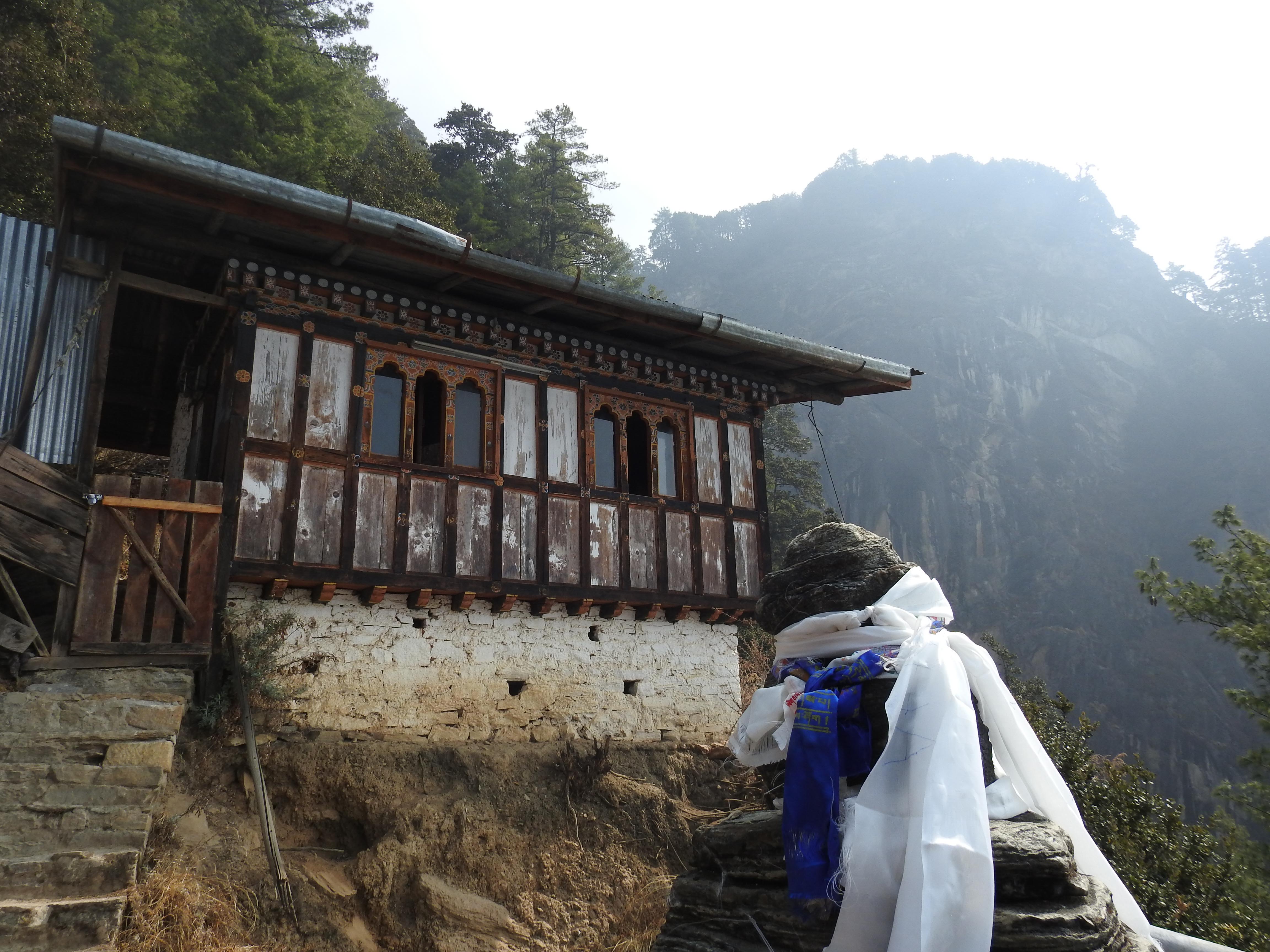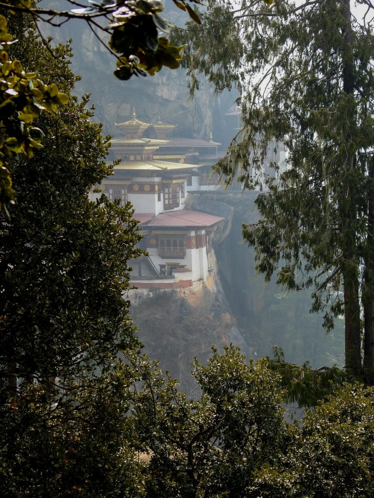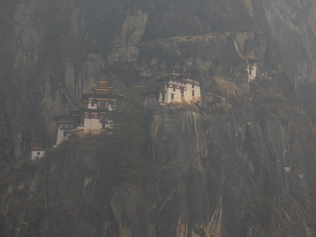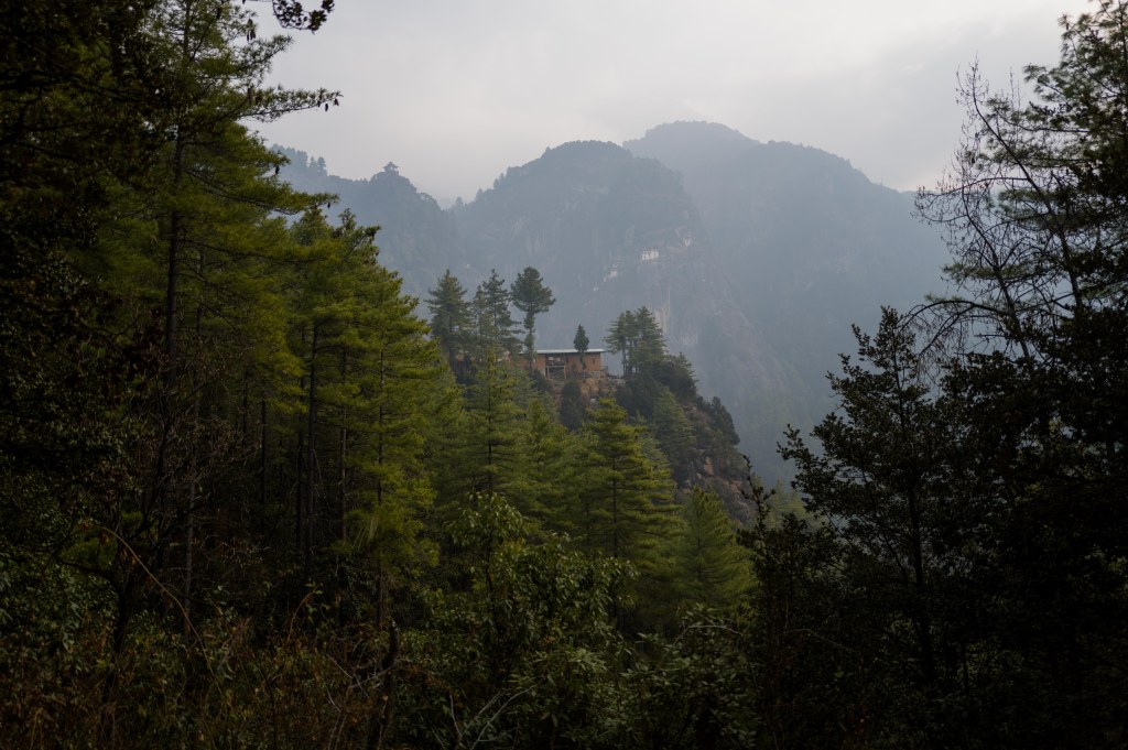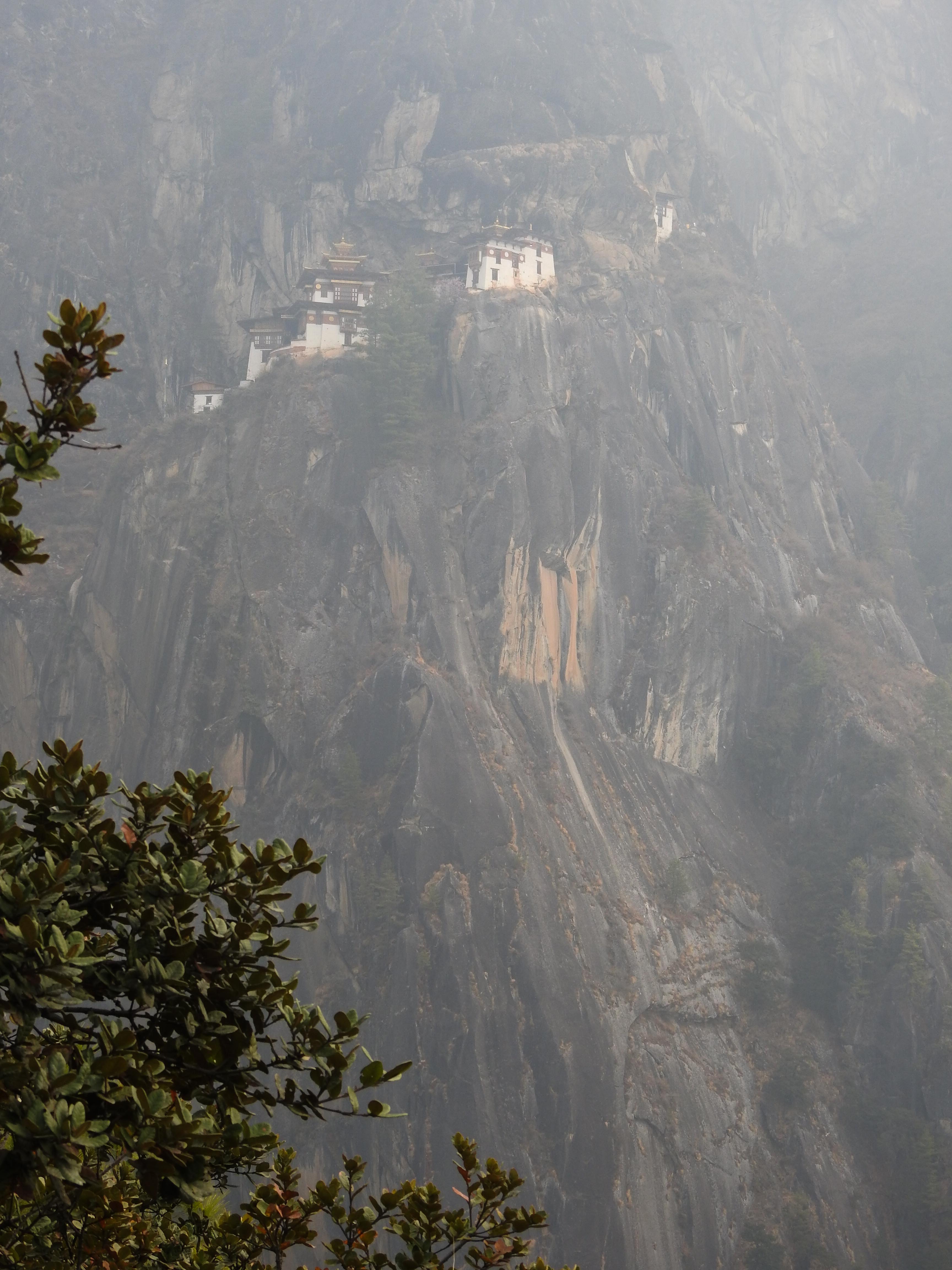 a smoke covered Taktsang sitting atop a mountain across the valley….it looked pretty daunting!