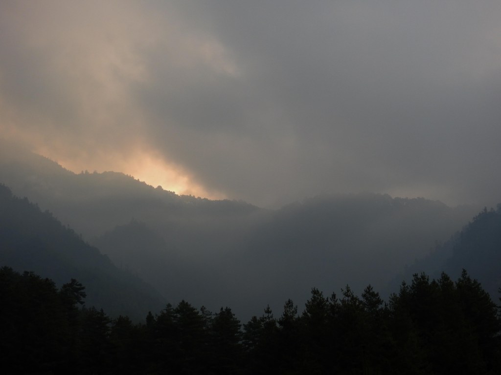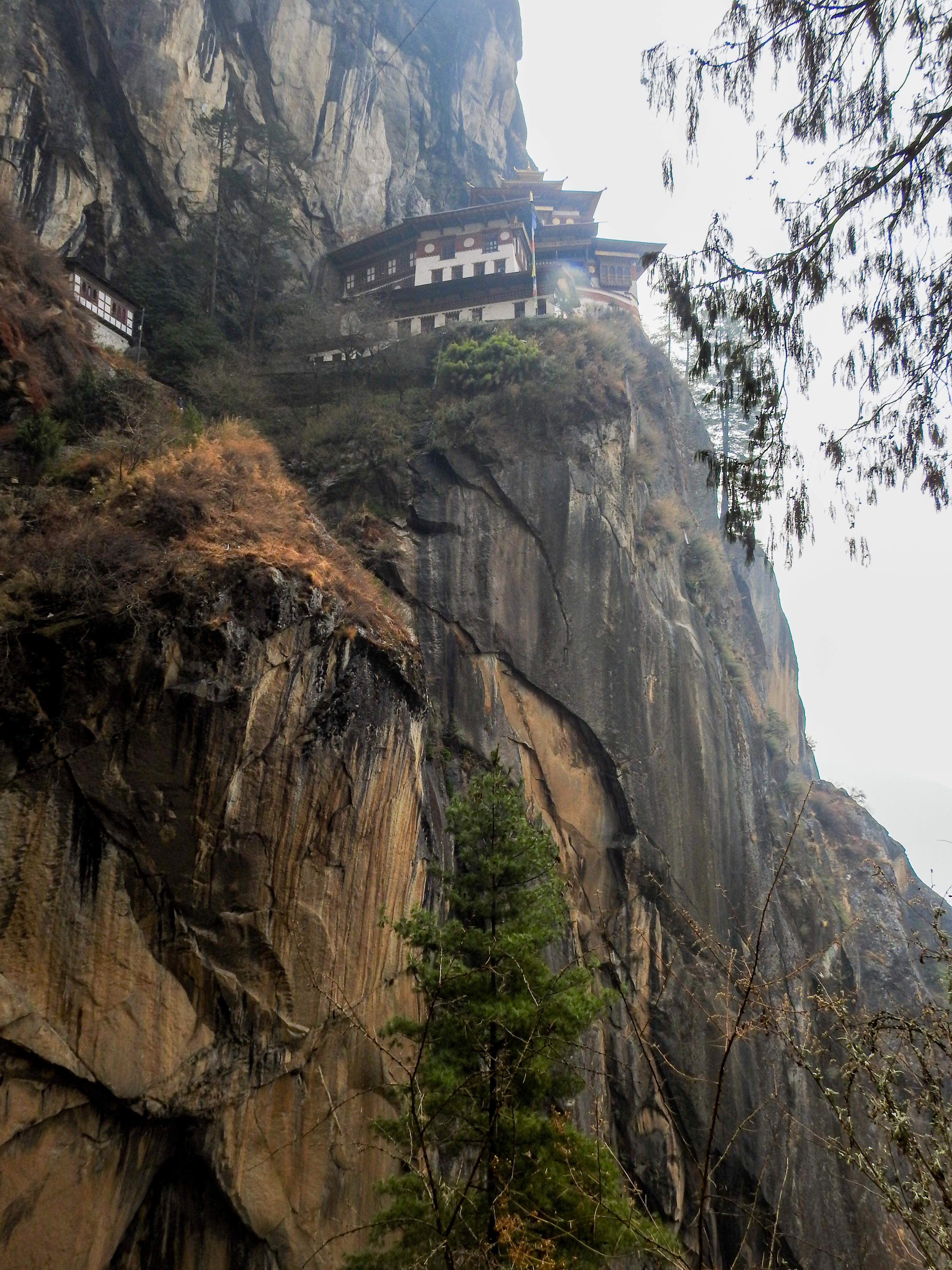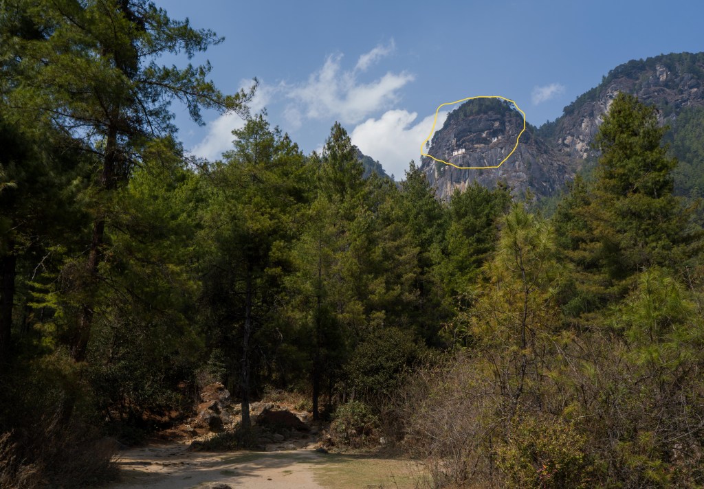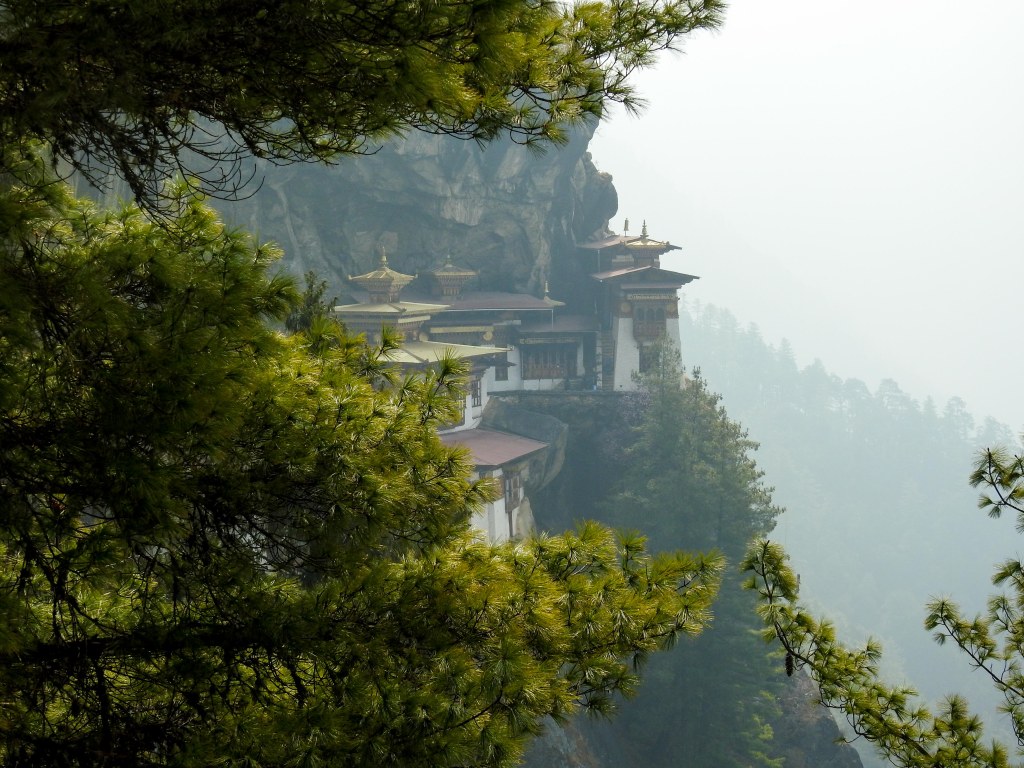 a smoke covered Taktsang sitting atop a mountain across the valley….it looked pretty daunting!