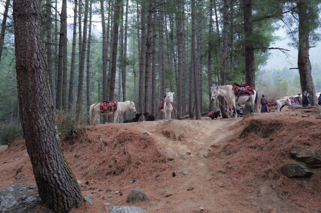 What time should you start? This was spring time in Bhutan and the morning temperatures were about 5C. You can obviously start anytime to suit you but do yourself a favour and get to the base of the mountain to start the climb by 630am….less people, cooler and less sunny on the return. We were picked up at 6am and were at the ticket counters by 630am. One of our group of senior citizens opted to go up halfway by horse/mule back; you are led by a horse guide to the half way point, the cafetaria which affords great views of Taktsang. The rest of us opted to hike up…this takes about 10 minutes more than the horse.