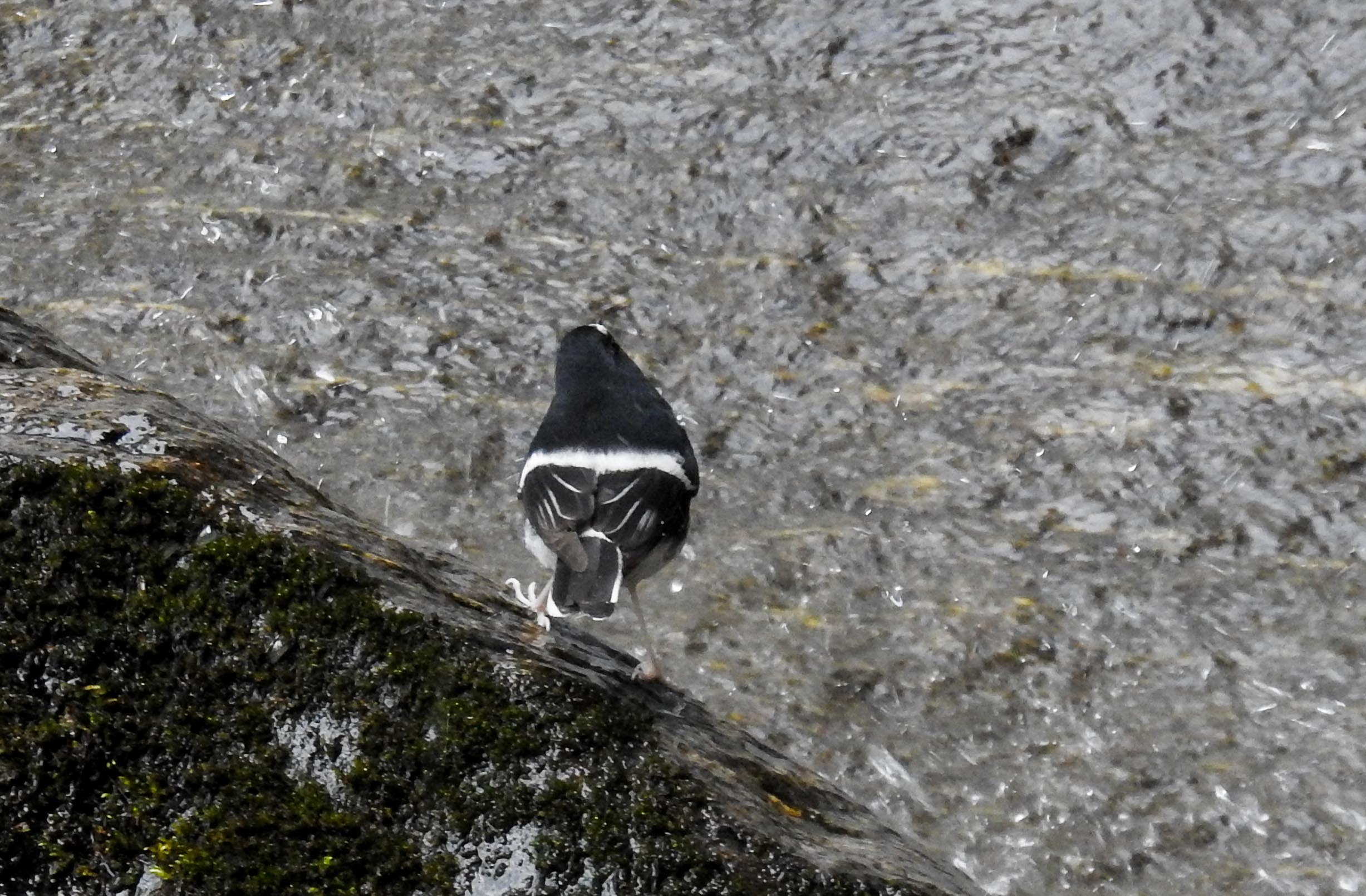 A little forktail hopped beside the waterfall