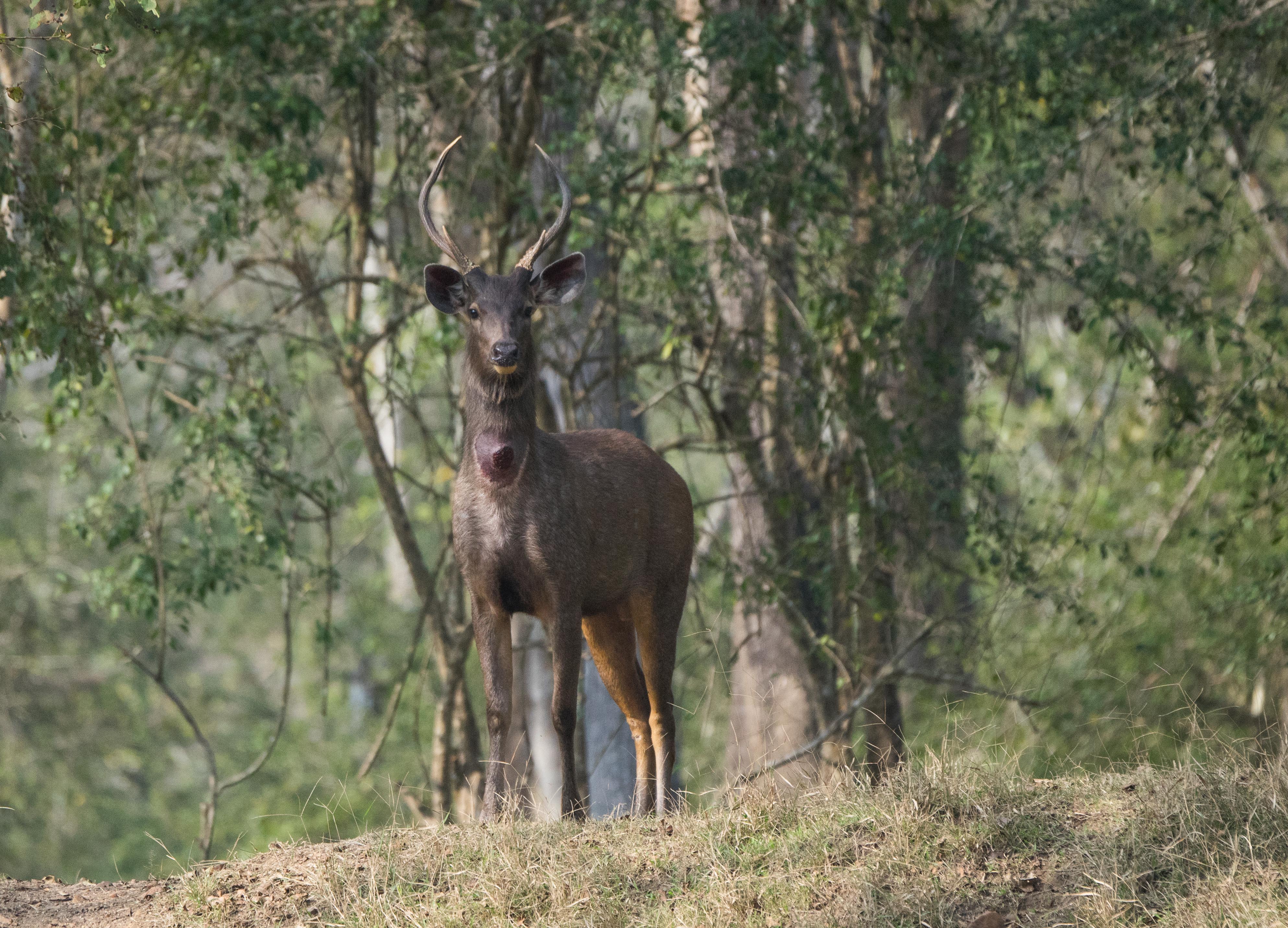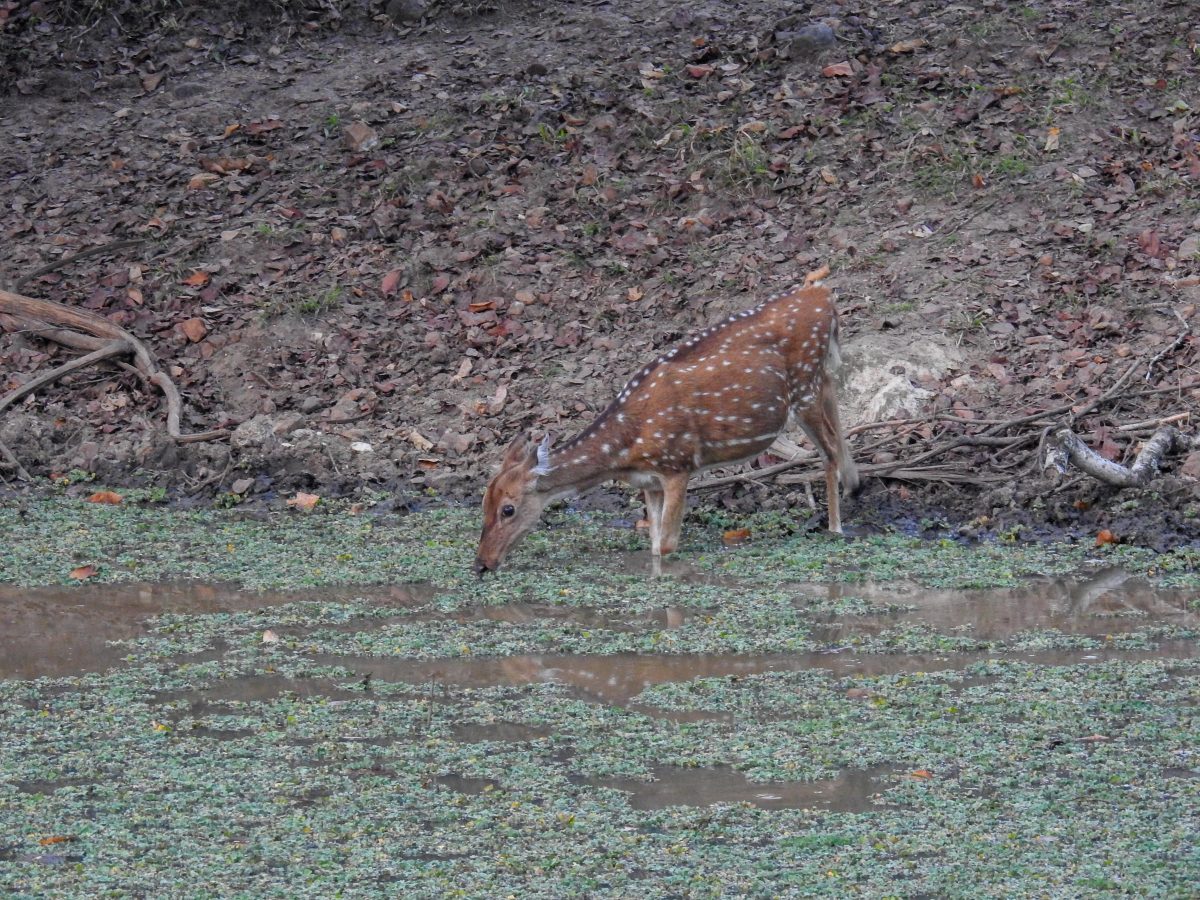 we then found this waterhole where a family of tuskers were bathingfrolicking babiesThis area is the elephant capital of India with the highest numbers of pachyderms per sq km in indiawe had a close encounter with this tusker who took exception to us and charged us, stopping just a few meters away thankfullyimperial green pigeonwe had time to do some birding…here the common hawk cuckoowild boarindian pond heroncommon flameback woodpeckera group of scampering spotted deera female gaur on our way outa spotted deer having a nightcapand back to the resort, the sunset welcomed us
