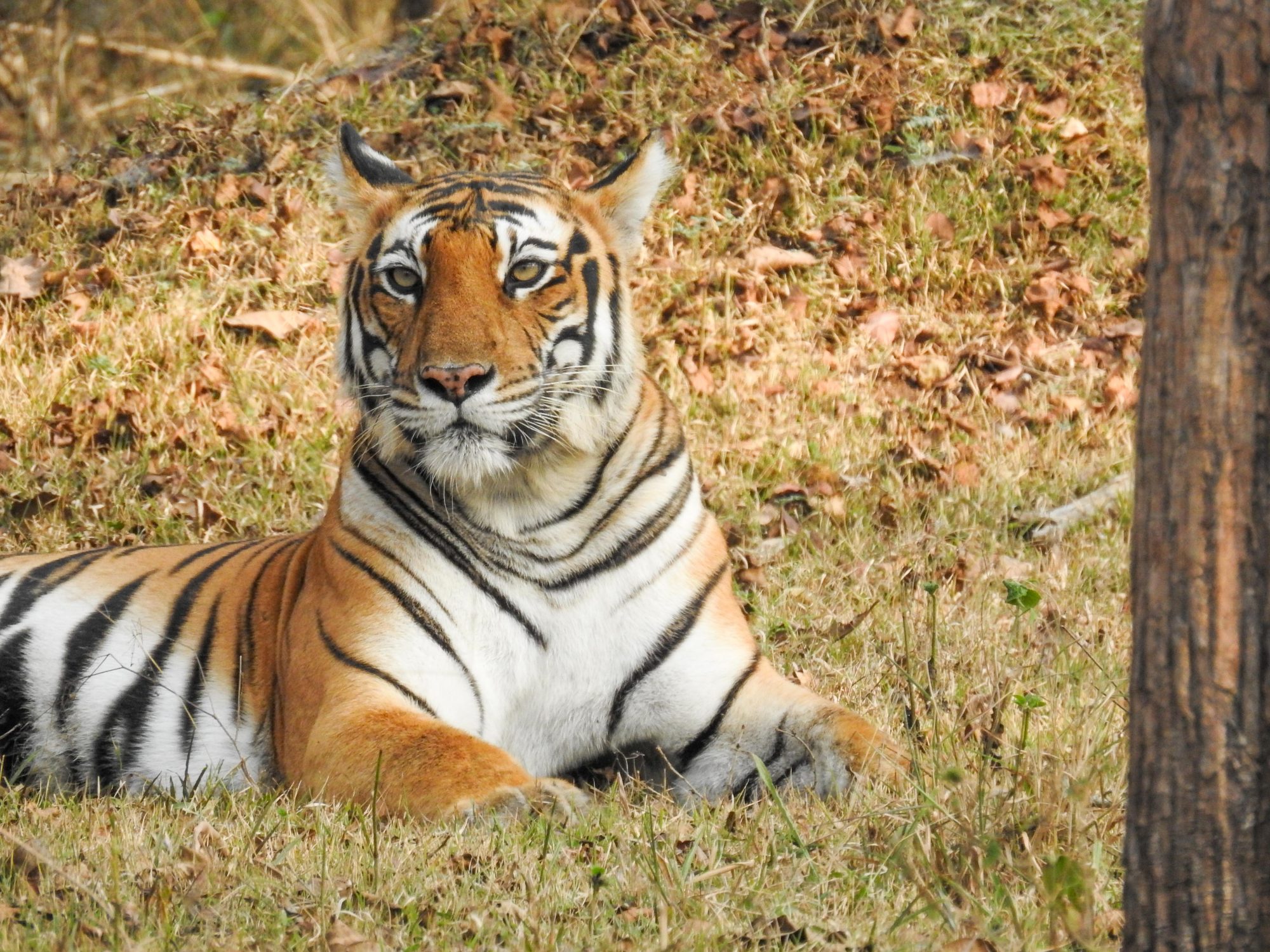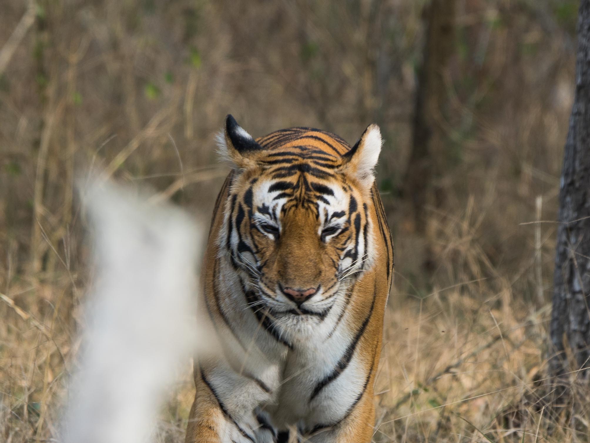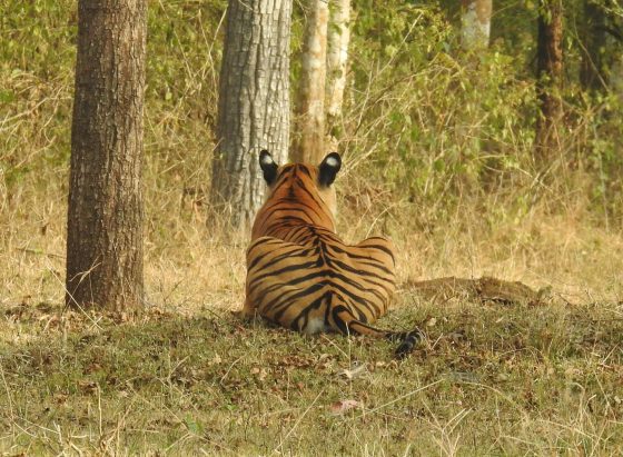 our cottage at Kabini Jungle water Lodgeour jeep with driver Muddu drove us to the Kabini entrance to Nagarhole Tiger reservea magnificent male GAUR welcomed us at the first waterholebeautiful spotted deer were abundantspotted deerbeautiful grey langurs were everywherewe stopped by this wooded area in zone A to wait to see if a tiger would showafter half an hour, we saw some movement behind the thicketand from afar, the unmistakeable tiger appeared afarshe started walking toward us..what a magnificent beast!she sauntered casually nearer..admire the tail detailand settled comfortably, her orange upper pelt contrasting with the pure white underside…her stunning pelt from the backposingthe back view of her ears…black with white tufts